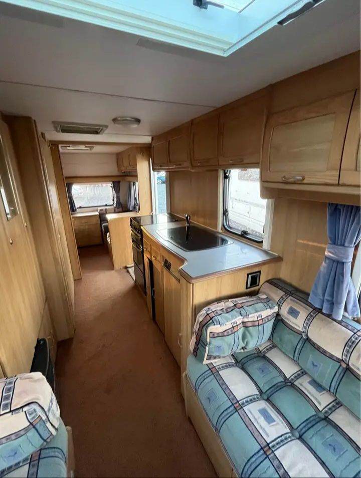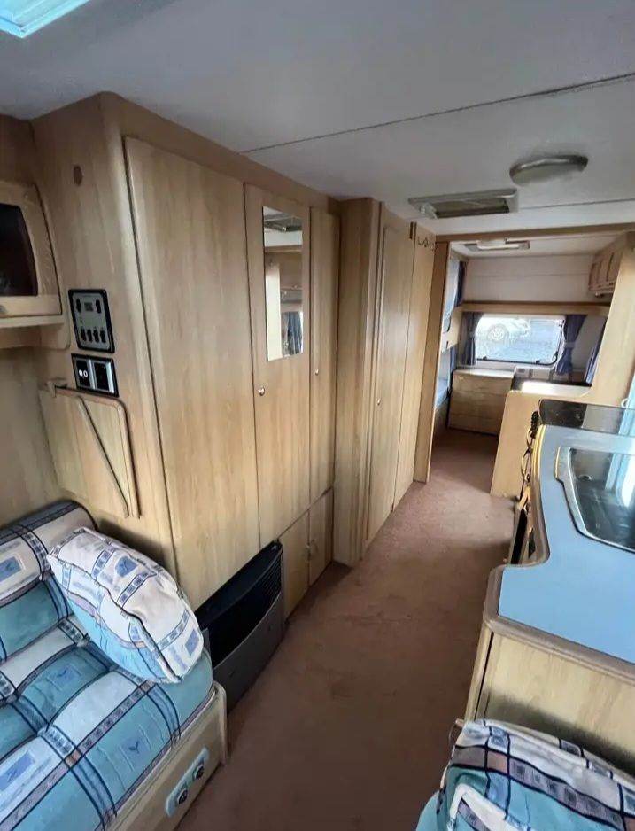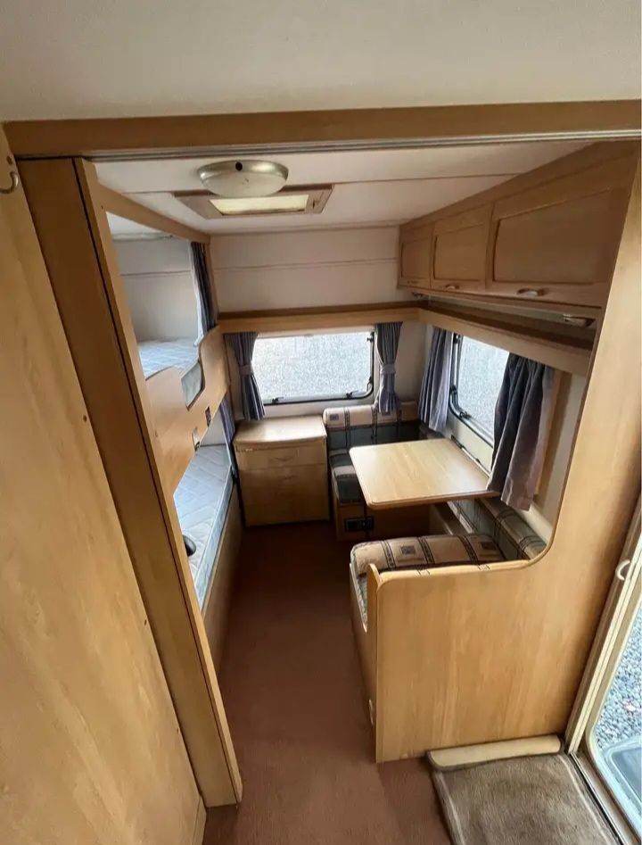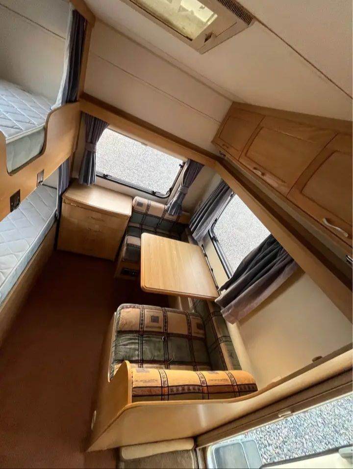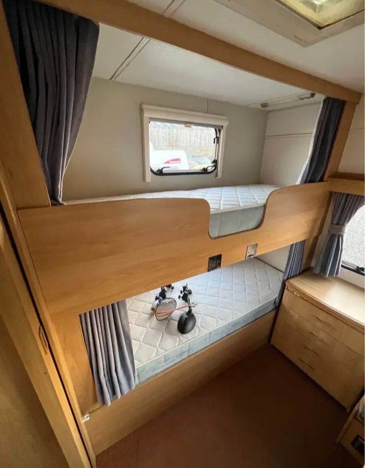 Here we have for sale is a 2004, twin axle fixed bunkbed Lunar Caravan in good condition for its age. This caravan posts are great layout, featuring large seating area at front which can convert into two single beds or one large double with plenty of overhead and underneath storage to the middle of the van. You have kitchen with gas oven, grill, Hobbs and sink, three-way fridge and Truma heating opposite you have large wardrobe and bathroom with cassette toilet sink and shower and finally to the rear. You have fixed. Bunkbeds with a dinette opposite, which can convert into bunkbeds also. Comes with awning, water, barrel hook up lead motor mover all the things you need to go on holiday. Bargain price for quick sale if you’re after a cheap van for a family here she is