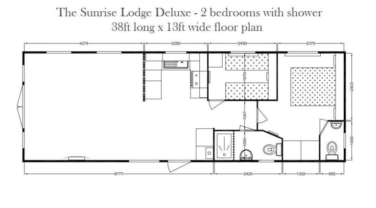 The model on show is the 38ft x 13ft (internal measurement) 2 bed version, which comes fully fitted with kitchen, bathroom, en-suite and beds but with a spacious empty living area for you to add your own furniture! We’ve found this a major selling point in the past especially for people who are doing building works or renovations, so they don’t have to store their furniture. We can also provide it furnished if you wish for a little extra.