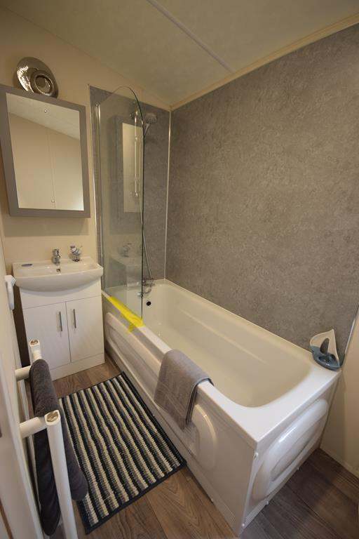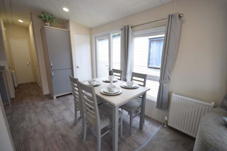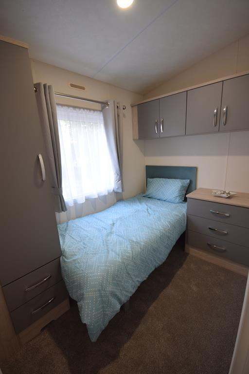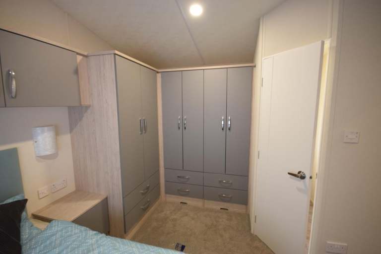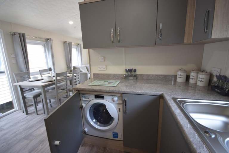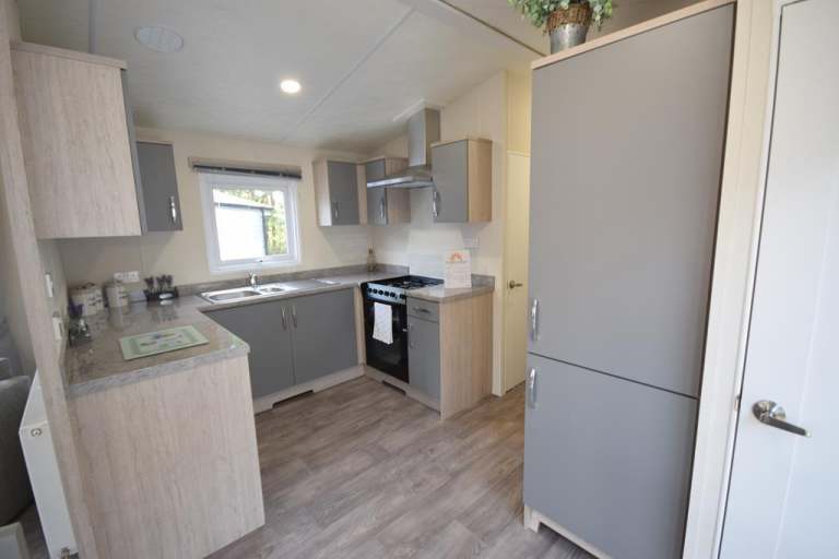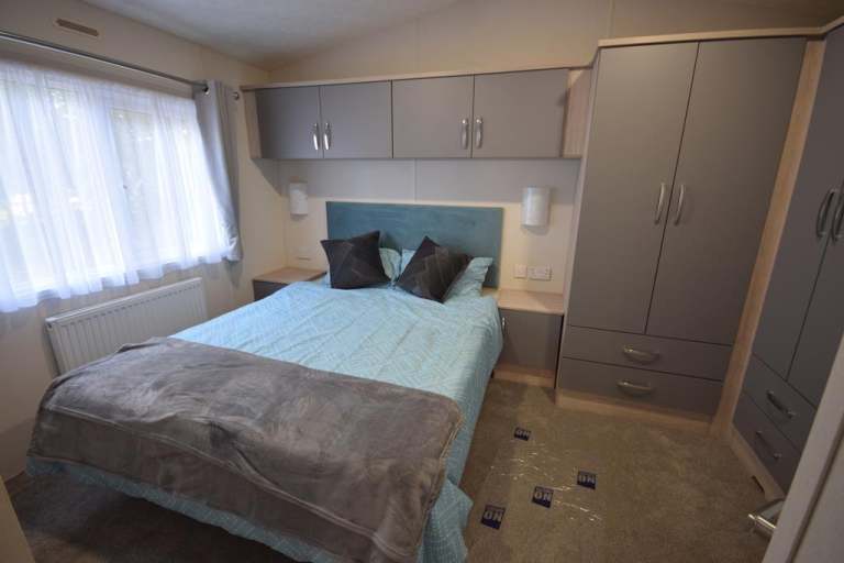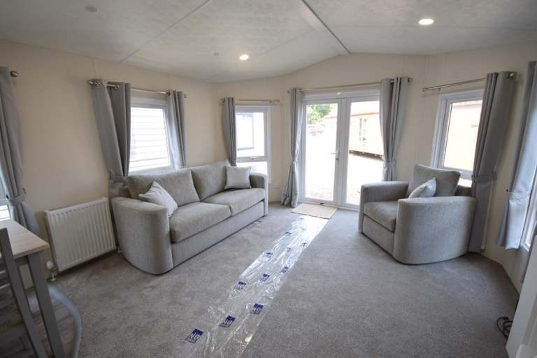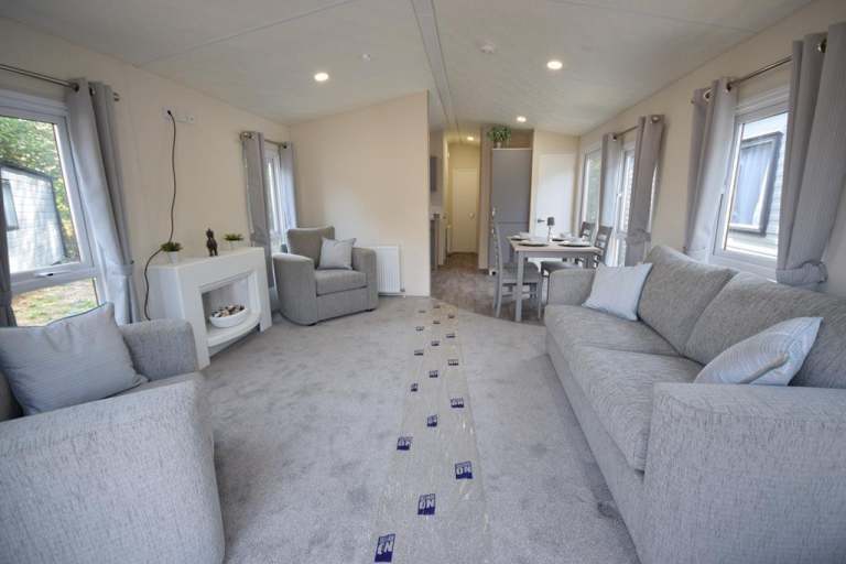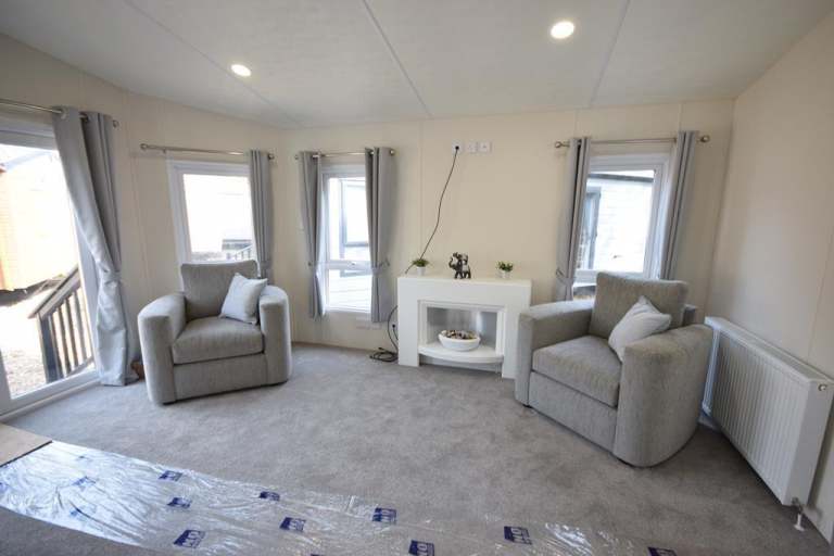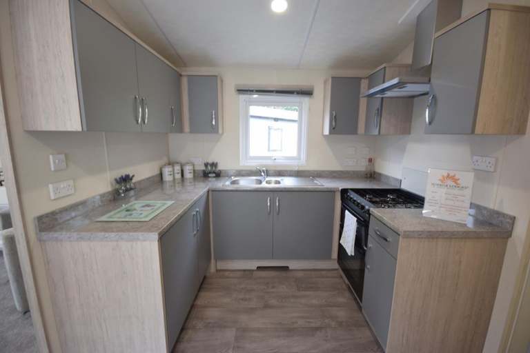 The model on show is one of our newest additions to the range; The Sunrise Lodge Deluxe ‘Super’, a generous size at 40ft x 13ft, with 2 or 3 beds. The 2 bed version as pictured, comes fully fitted with everything you need, from the living room furniture, to kitchen and appliances, bathrooms, en-suite and beds. We can also provide it unfurnished if you wish.