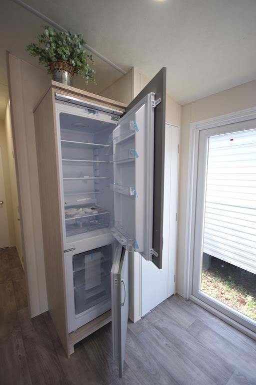 The kitchen is very impressive with lots of work space and cupboards, low level spotlights, integrated large fridge freezer, washer/ dryer and oven & hob with extractor fan. All wood throughout from here is finished in stunning Italian Molina and cream gloss. You can choose to have just Molina without the gloss if you prefer, it’s pictured on one of our other models.