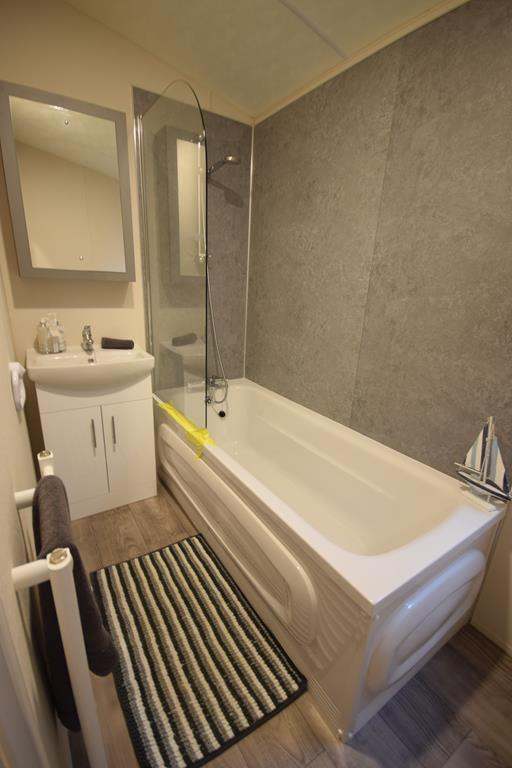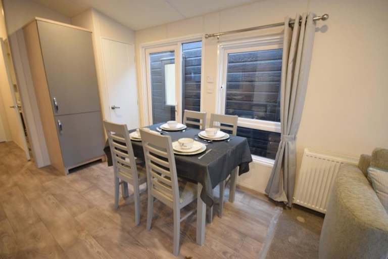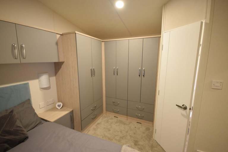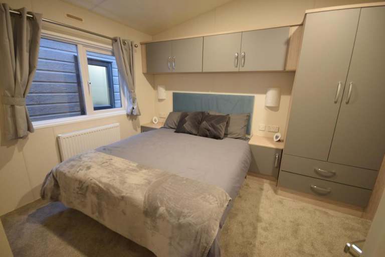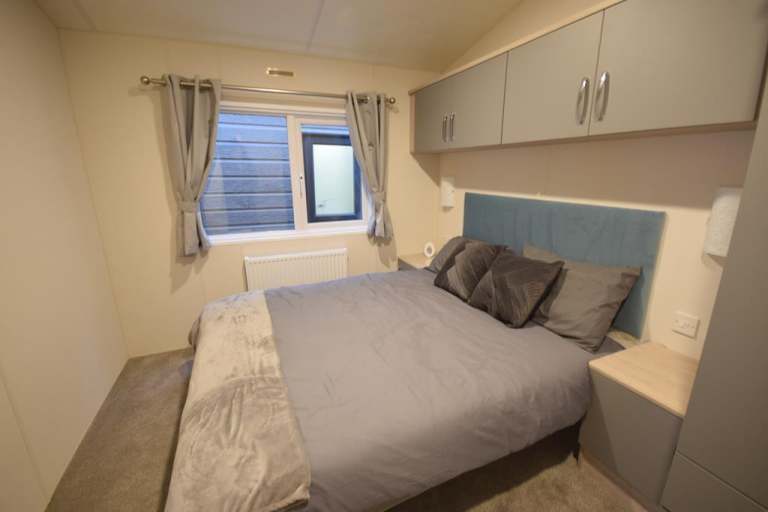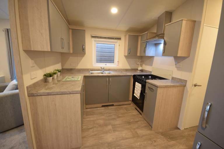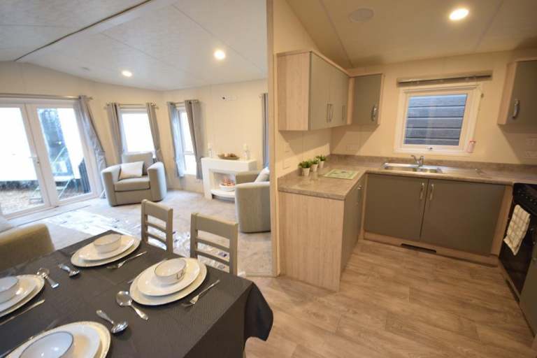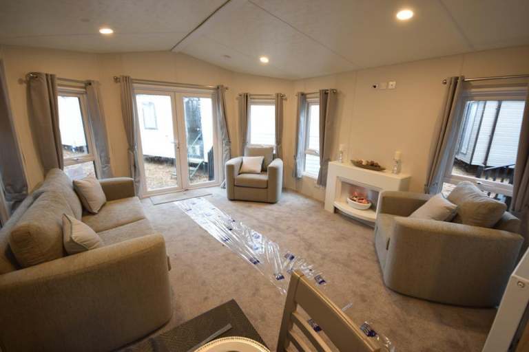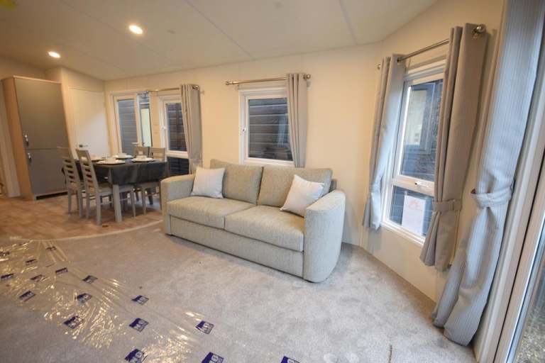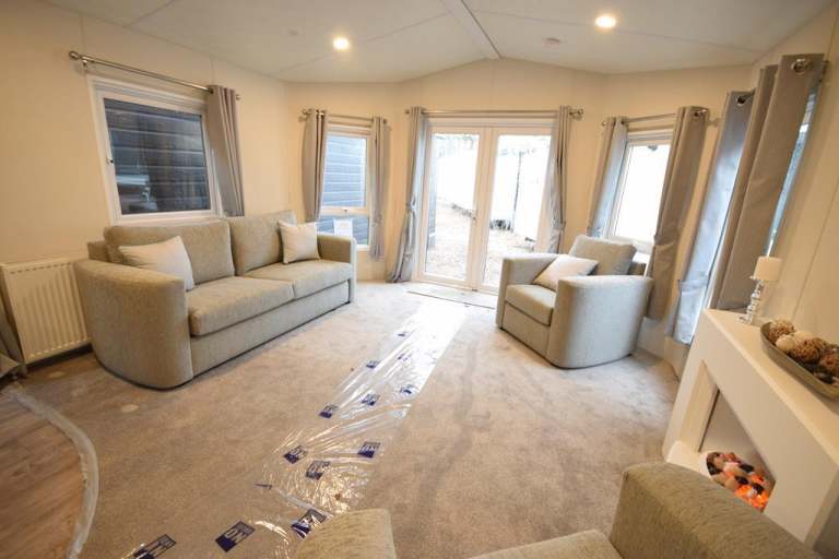 The model on show is one of our newest additions to the range; The Sunrise Lodge Deluxe ‘Super’, a generous size at 40ft x 13ft (internal measurement) with 2 or 3 beds. The 2 bed version as pictured, comes fully fitted with everything you need, from the living room furniture, to kitchen and appliances, bathrooms, en-suite and beds. We can also provide it unfurnished if you wish.