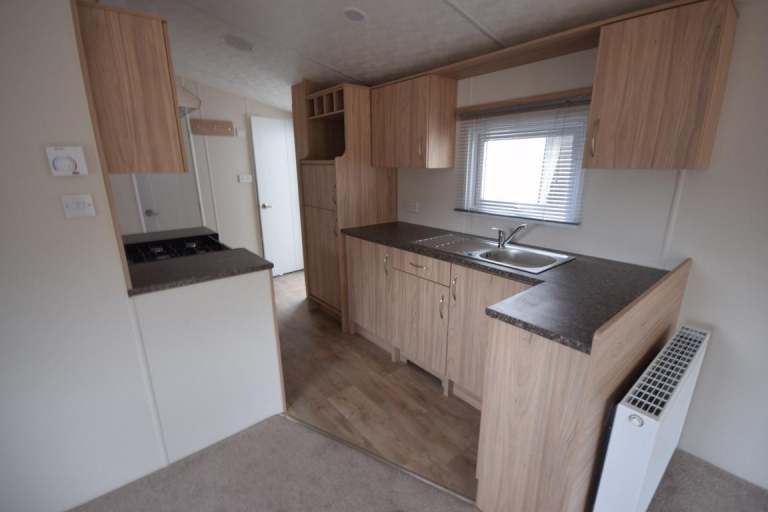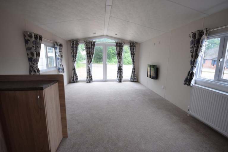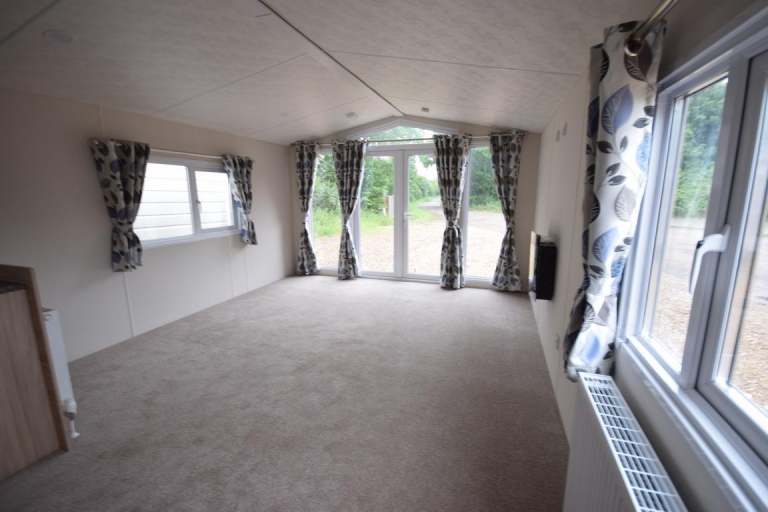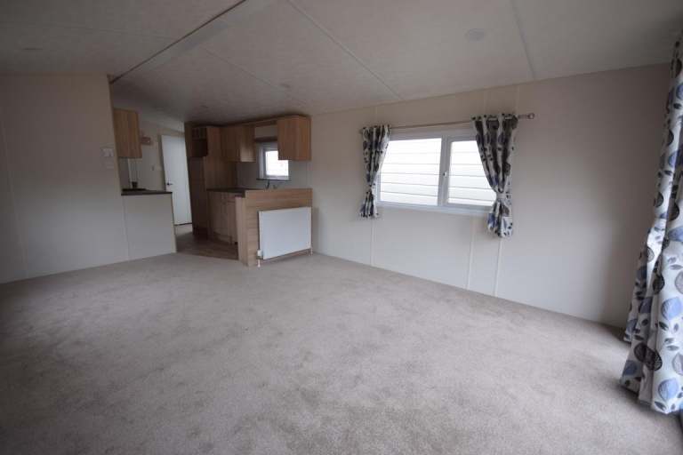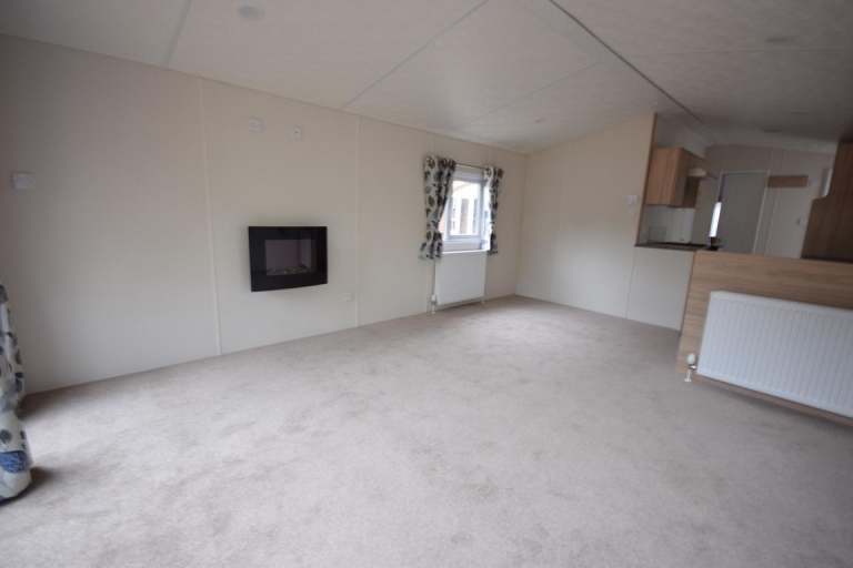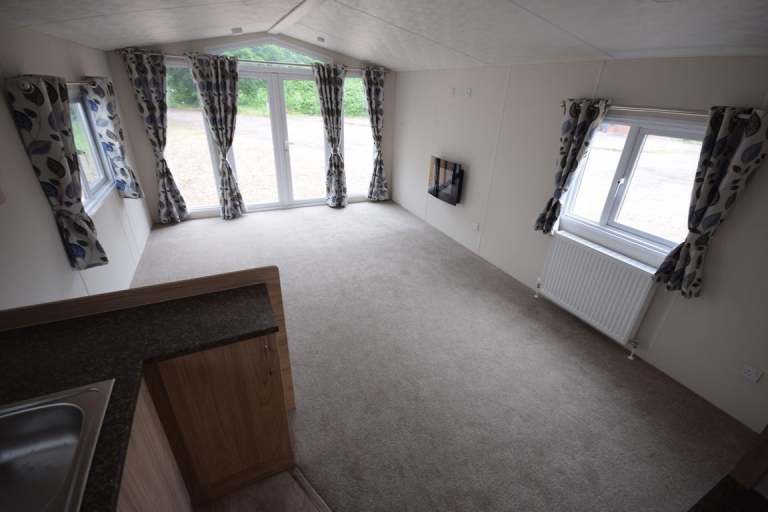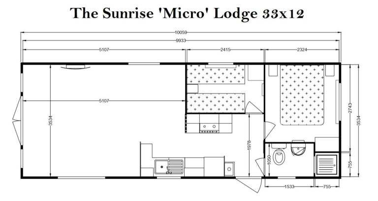 This is our newest addition to the Sunrise Lodge range – our Micro Lodge! We have a 1 bed 31×12 and this model a 2 bed 33×12. A modest overall size but still with a very large lounge, 2 bedrooms with storage, and all the important bits left in. This Sunrise Lodge comes fully fitted with everything you need, excluding the living room furniture, it includes kitchen and appliances, bathrooms, beds, mattresses, carpets, curtains and light fittings.