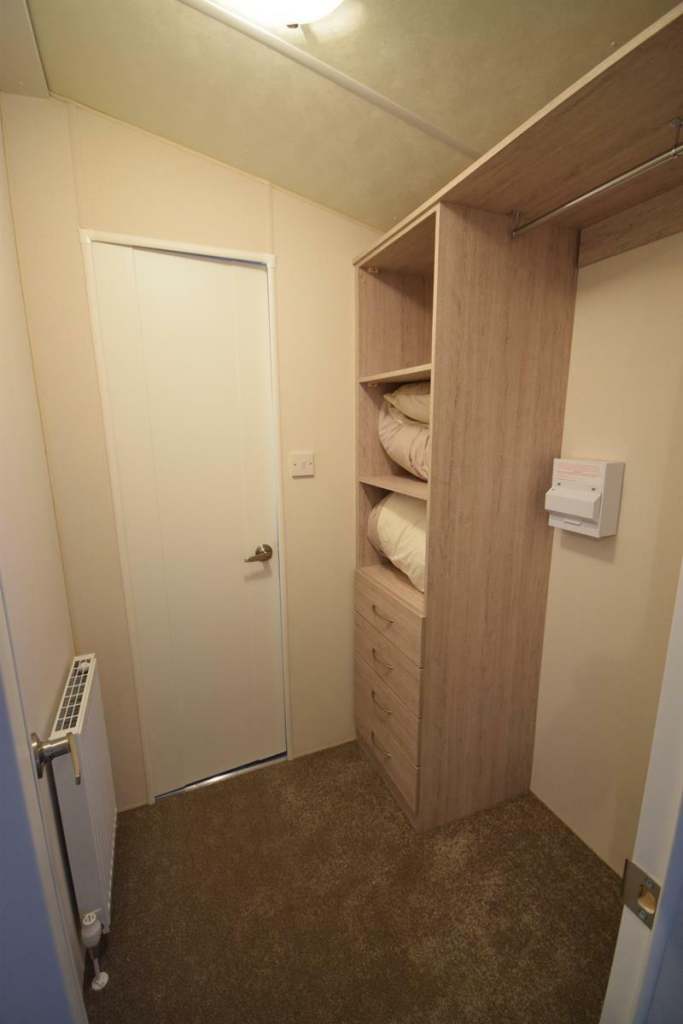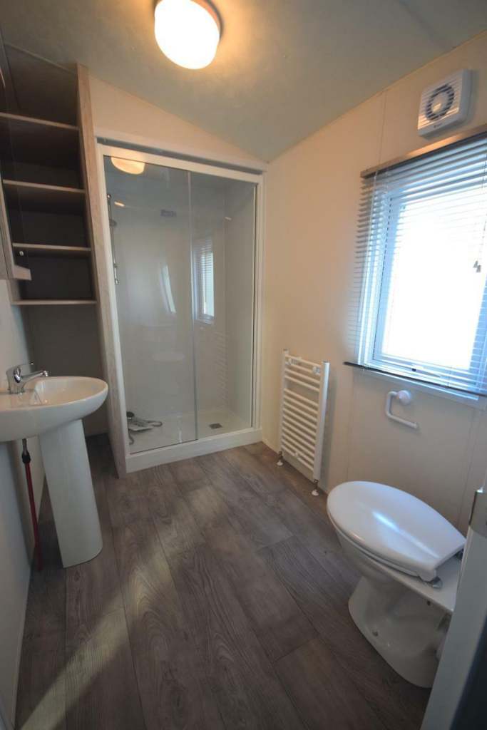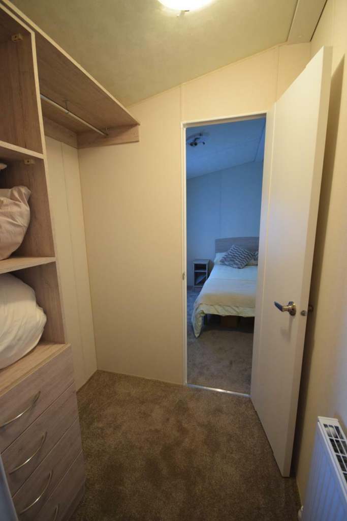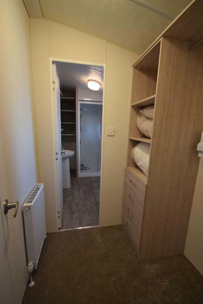 Perfect for clients with access issues, this unique addition to our Micro Lodge layouts sold immediately! But don't worry we've got more on order ready for next year! Sunrise Lodges all come with a fully equipped kitchen, plenty of workspace, storage, all integrated appliances included plus a highly efficient combi boiler to keep the place cosy all year round! Down the hall you have the very large bedroom; a full size King room, with walk through heated wardrobe, leading to the main shower room with fully enclosed shower, vanity sink, towel rail and toilet. A totally unique layout!