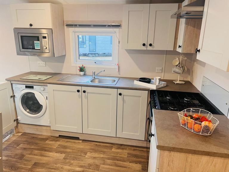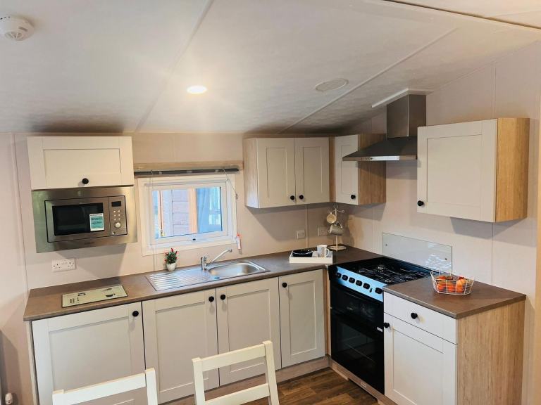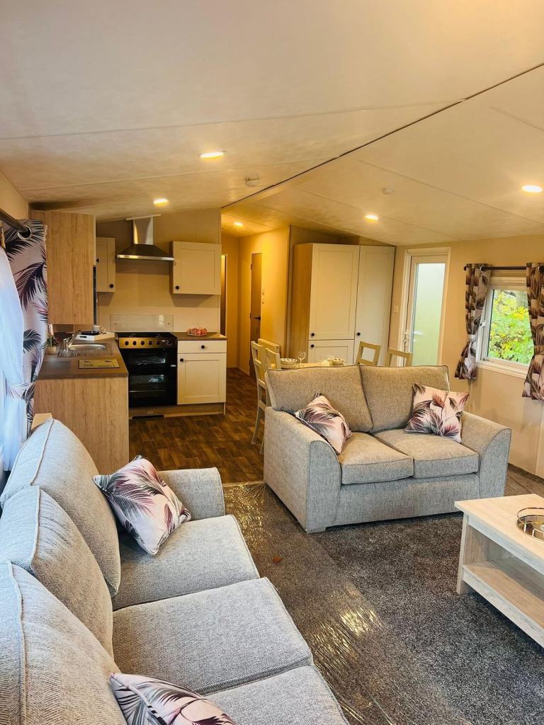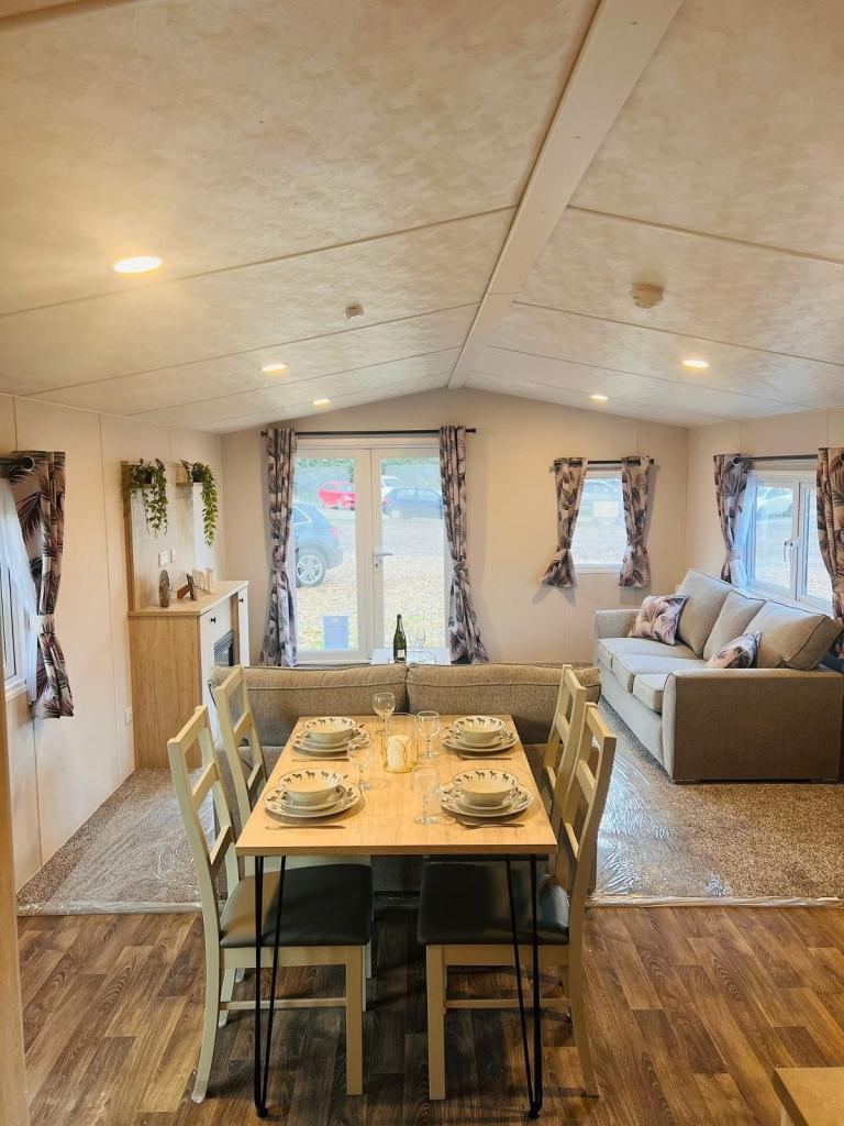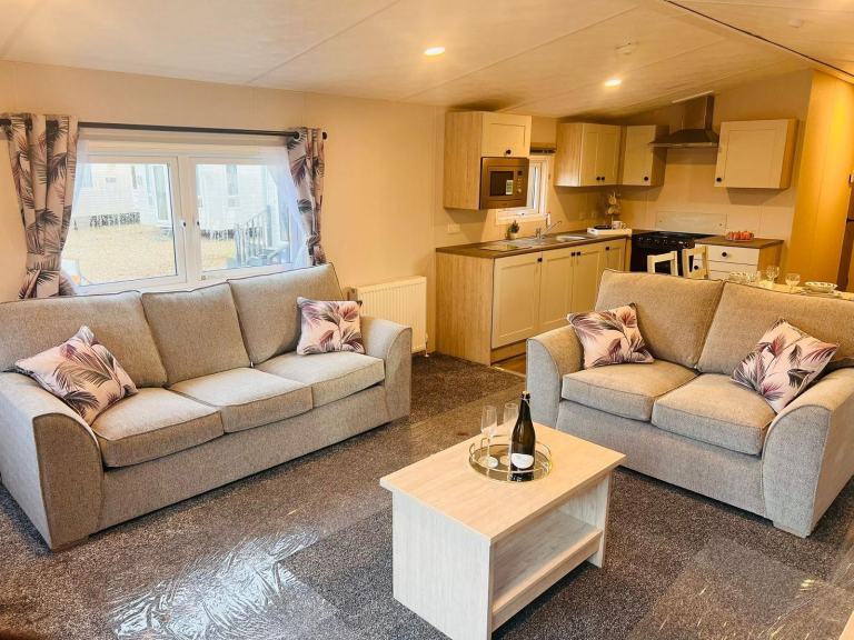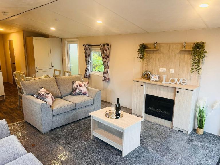 The living space is open plan with freestanding furniture included in the price, two big comfy sofas and dining suite. The lounge is a great size, with entertainment unit, electric fire and front opening patio doors.