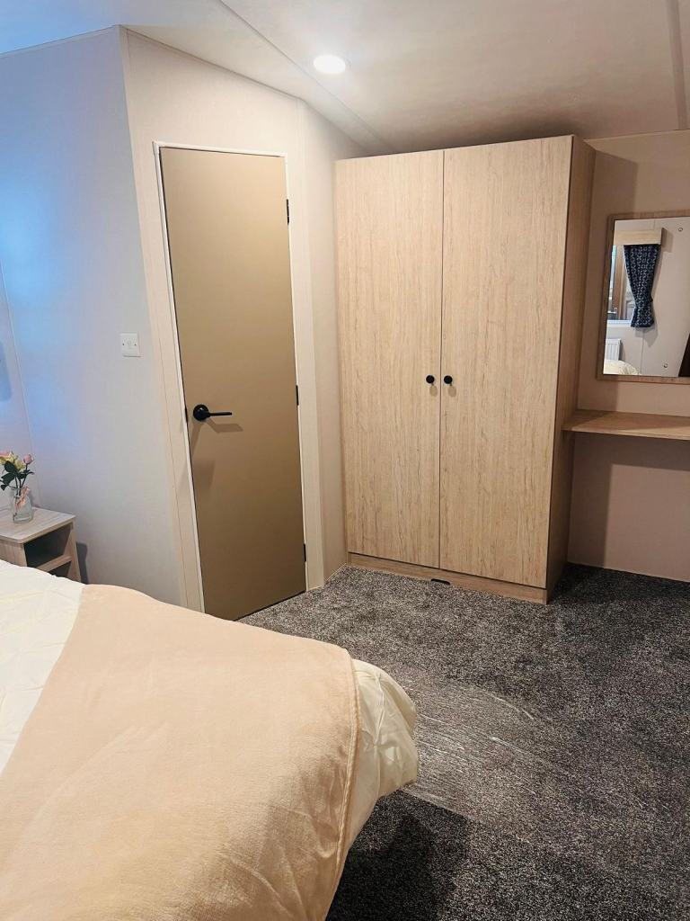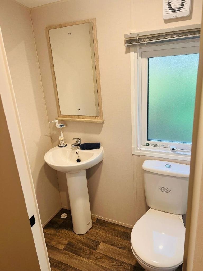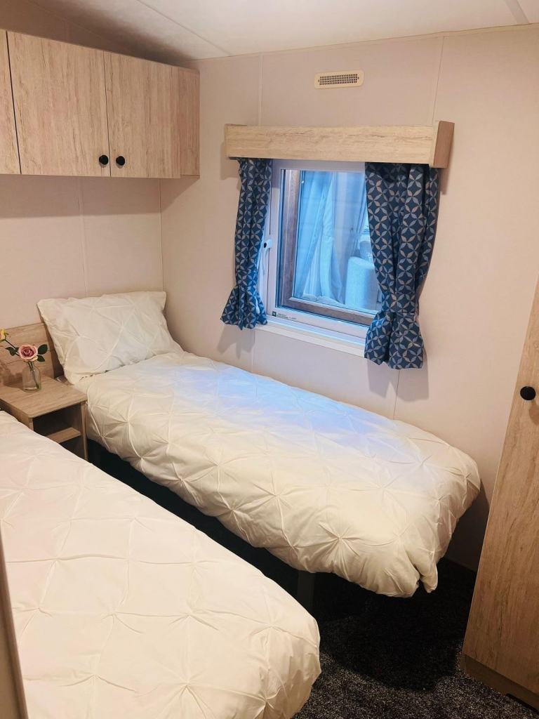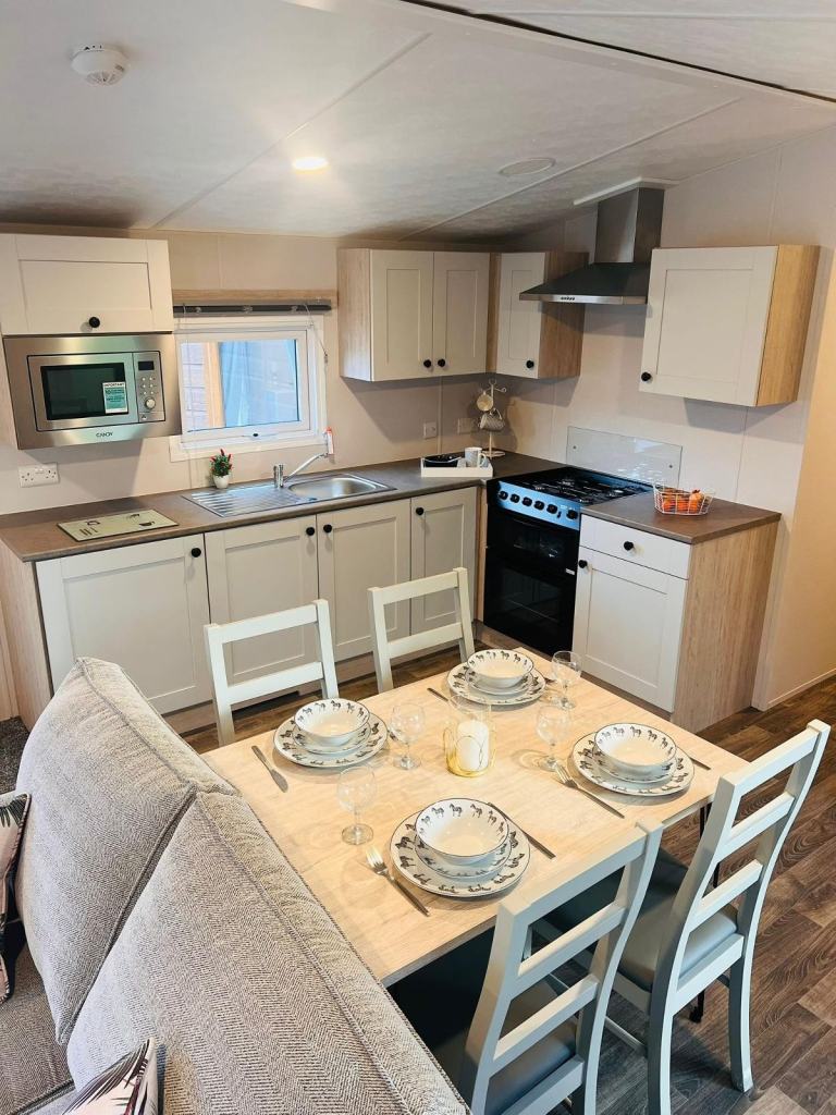 The living space is open plan with freestanding furniture included in the price, two big comfy sofas and dining suite. The lounge is a great size, with entertainment unit, electric fire and front opening patio doors.