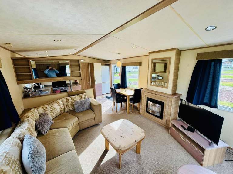 The caravan benefits from double glazing and central heating throughout and features a spacious open-plan living and dining area with fixed seating and a pull-out sofa bed, making it ideal for family use or guests.
