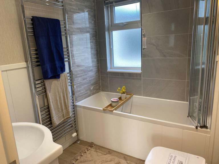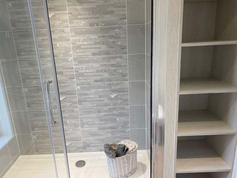 The En-suite has a large bath, a separate full width shower cubicle and a vanity unit with basin mirror.