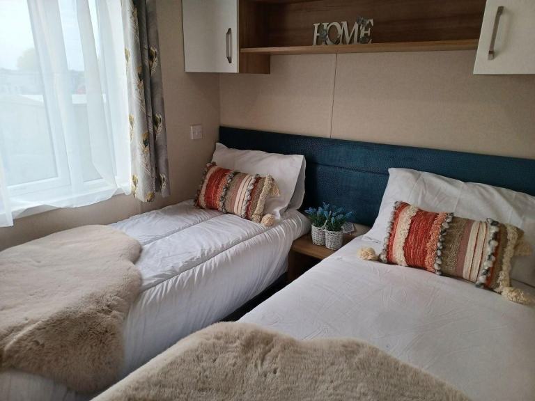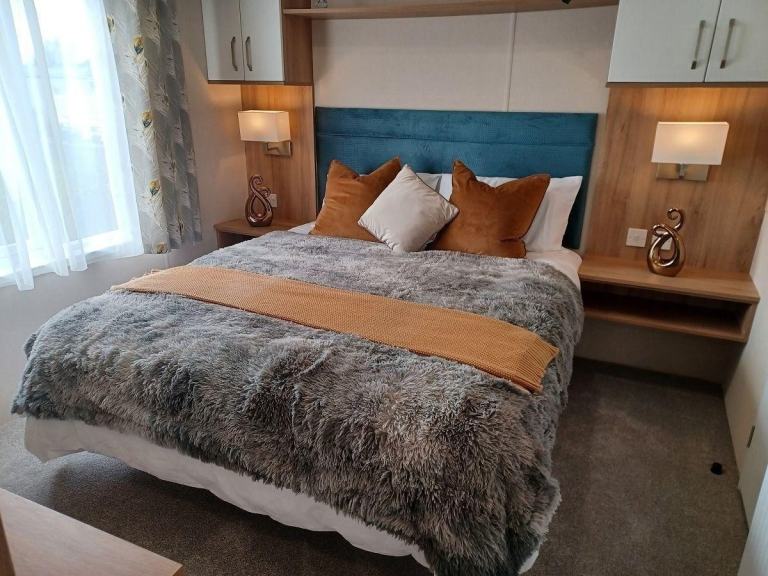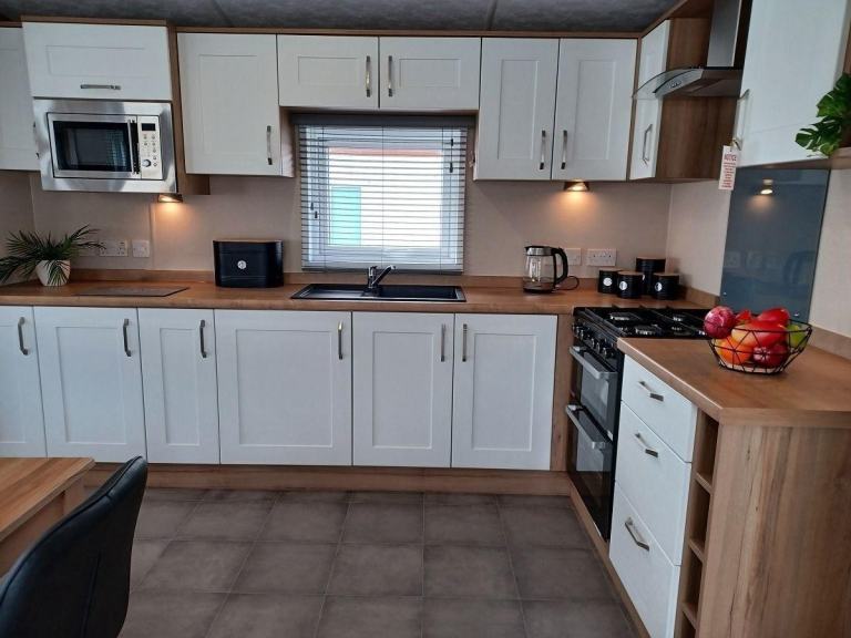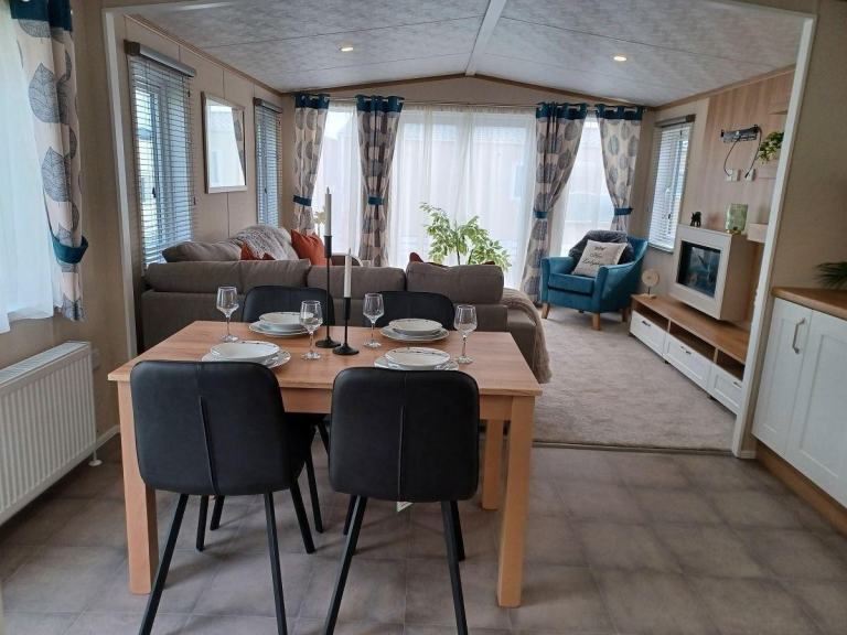 Beautifully presented Pemberton Marlow 42 x 14 offering a superb combination of space, comfort and modern design. The lounge is bright and welcoming with large windows and patio doors that let in plenty of natural light. Featuring a comfortable seating area, tasteful furnishings and a contemporary electric fire, creating a cosy yet modern living space that opens directly onto a south facing balcony – ideal for relaxing outdoors or entertaining guests. The kitchen is thoughtfully laid out with ample worktop space and cupboards and includes a washing machine, integrated oven, microwave, hob and fridge freezer. Just off the kitchen the dining area provides a comfortable space to enjoy meals, with a freestanding table and chairs set beside the window. The master bedroom offers a calm and restful retreat and has a lovely ensuite. Included are bedside tables and generous built-in wardrobes. The second bedroom is perfect for guests or family visits. The bathroom is well appointed with a large walk in shower, wash basin and vanity storage, all finished to a high standard with modern fittings. The Pemberton Marlow offers year round comfort with double glazing and central heating as standard.