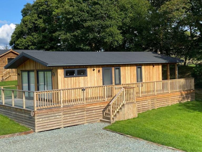 This cedar has recently been oiled and comes with glass balustrade on the front decking and rear decking. An under cover seating area looking out to woodlands and the hills. This lodge sits on a very spacious plot, with double parking space.