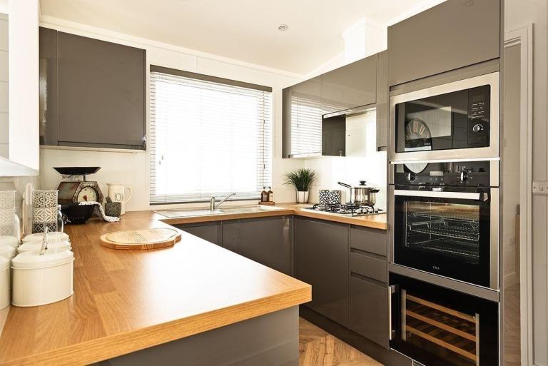 -Kitchen features solid oak effect worktop, four burner gas hob, eye level oven, microwave, dishwasher, wine cooler, fridge/freezer and dual washer/dryer