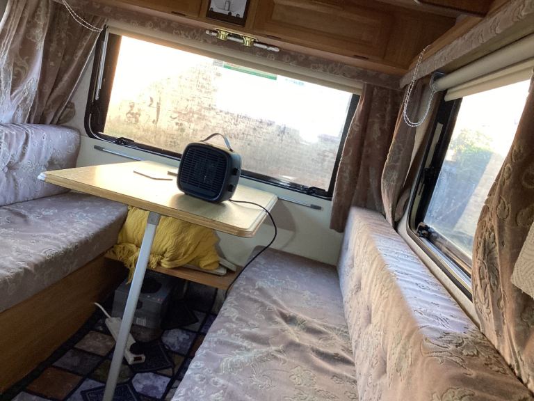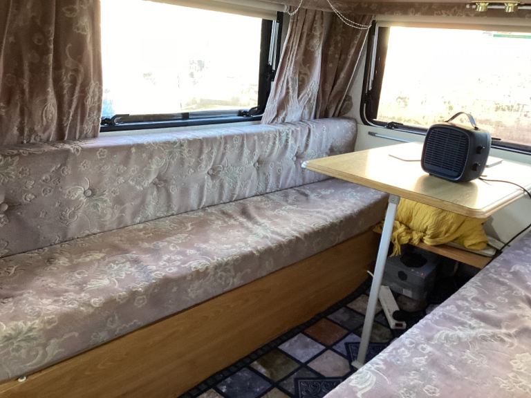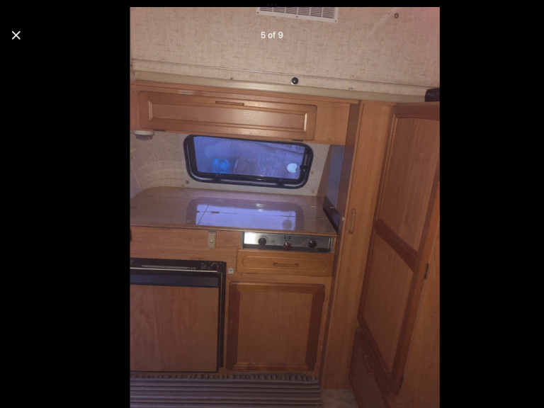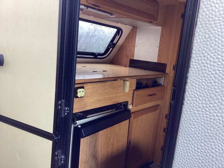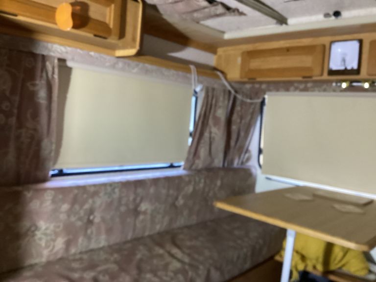 Been updated clean etc. 3 good tyres, gas cooker, mains or 12v electric, I’ve utilised the corner ‘wardrobe’ into a small but functional toilet area.