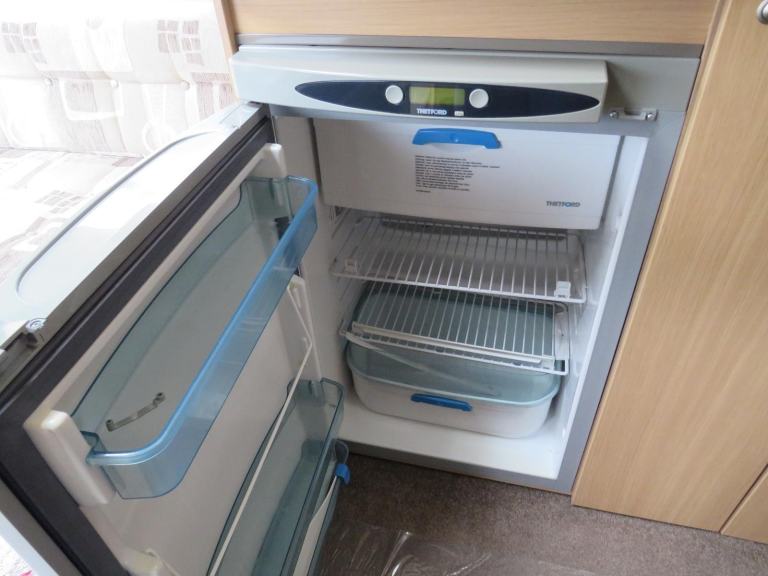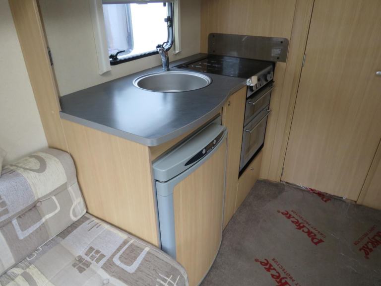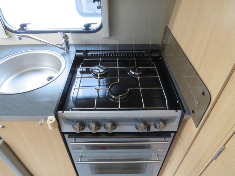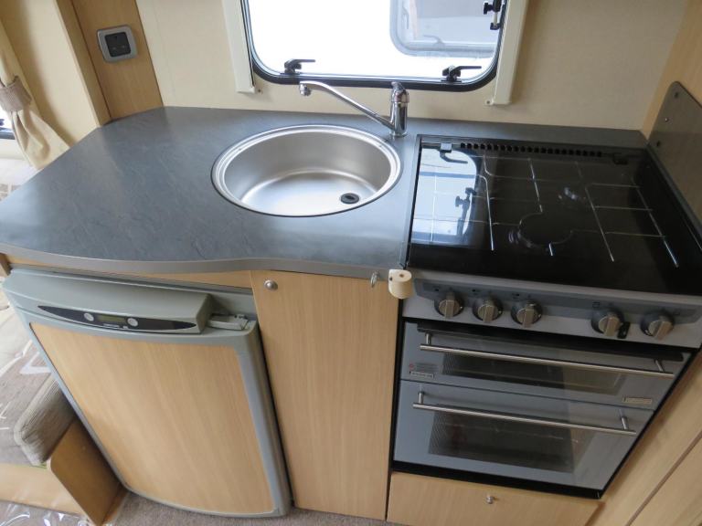 The kitchen is well appointed, 3 way fridge, gas hobs/oven/grill, sink with hot and cold running water and loads of cupboards and worktop space.