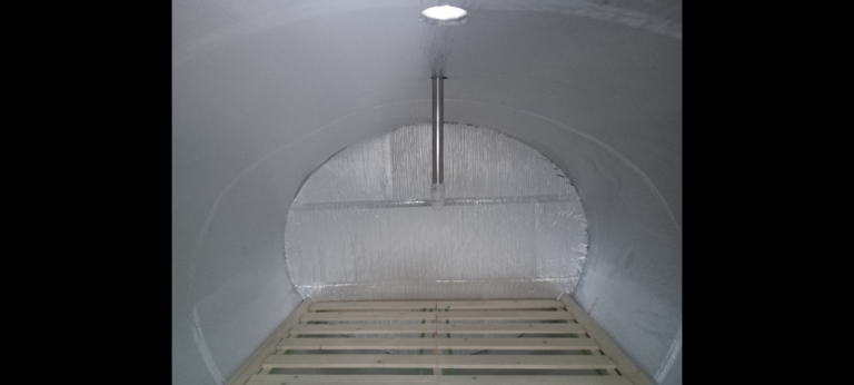 Inside are two small single mattresses side by side on a wooden bedframe with enough headroom to sit up right and ample under bed storage for food and water. Leaving 1m long floor space at the foot of the bed under the 45cm diameter hatch which is lockable from inside and outside. 3 adjustable air vents with mesh filter and NATO mask filter pump adapter and radio antenna mount. 1 waste water drain.