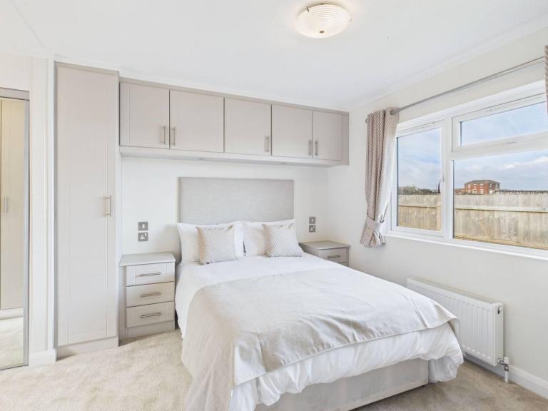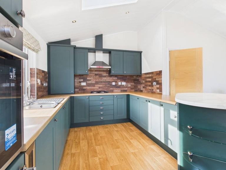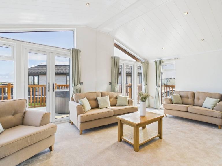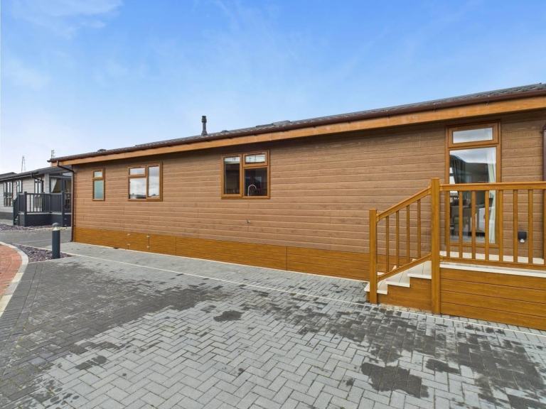 The Stately Albion Warwick Executive at Sandy Beach Holiday Park, Bacton, Norfolk offers an elevated lodge experience with premium features throughout. Perfectly positioned right on the beach with stunning sea views, this spacious lodge is designed for both comfort and style. The thoughtfully planned kitchen features a Velux window for abundant natural light, upgraded cabinets with elegant glass feature shelves, and an integrated wine cooler. The open-plan living area showcases a fully vaulted ceiling with a dramatic glass front elevation, creating a light-filled and airy environment. Externally, a beautifully crafted gable adds to the lodge’s charm and overall “wow” factor.