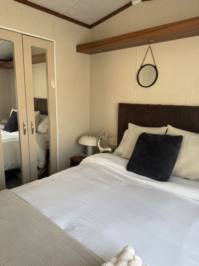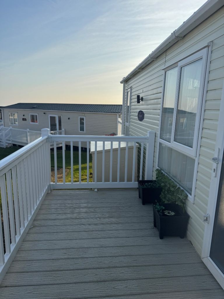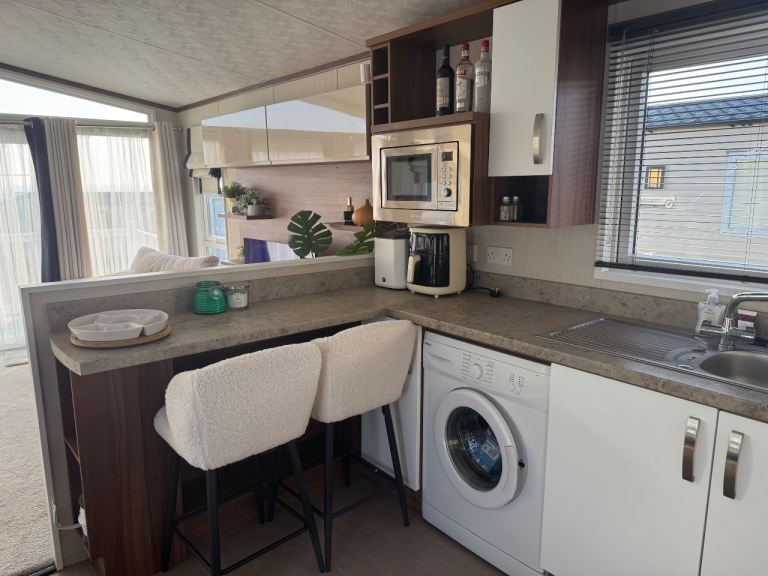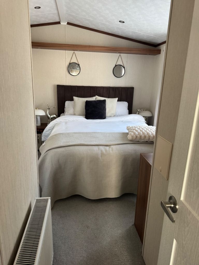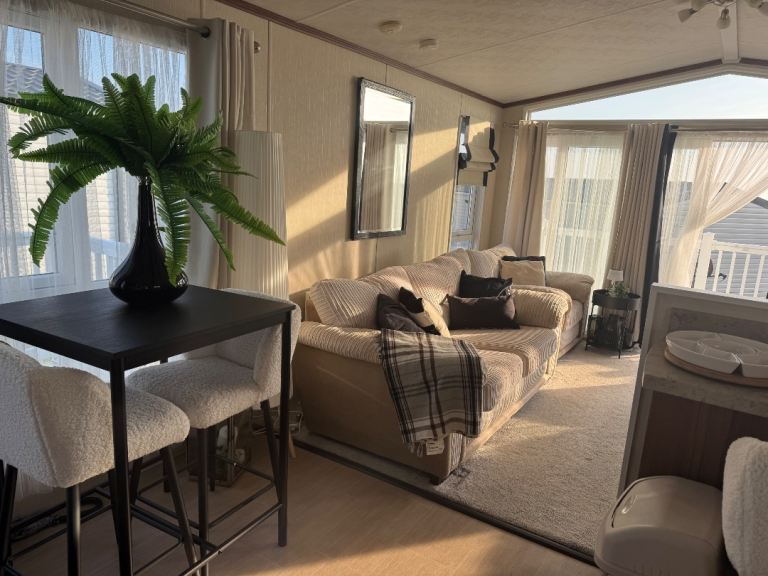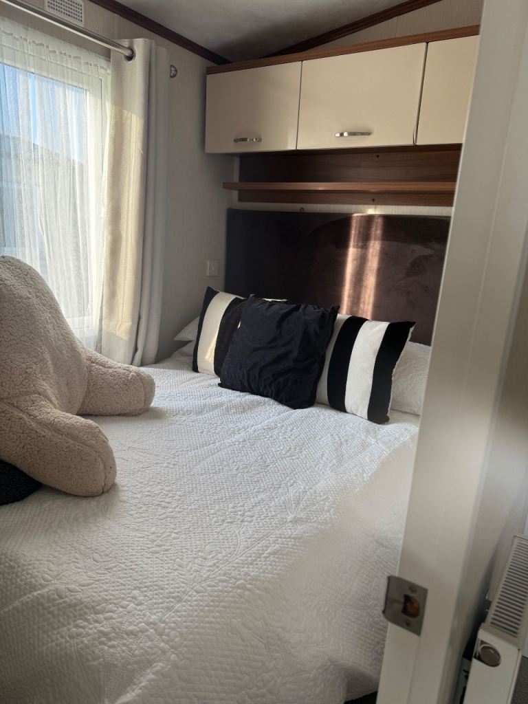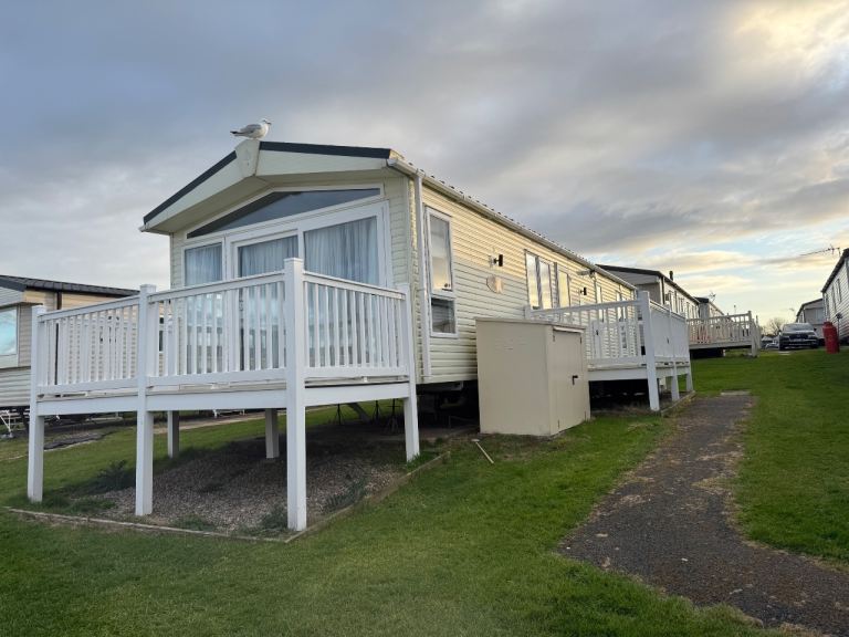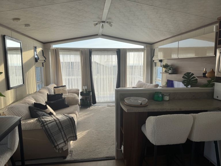 2014 2bedroom residential spec 40x13 ft unit . Side and front decking from French doors . Double glazed and central heated. Two bathrooms -one shower cubicle and other en-suite bath . King size bed in en-suite bedroom . Double bed in 2nd -tv on wall . American fridge freezer and washing machine in kitchen . Free standing sofa bed and two chairs in living room with flat electric fire. Private parking . Sea views from both deckings .No age limit on park . Contact me if any questions. Thanks .