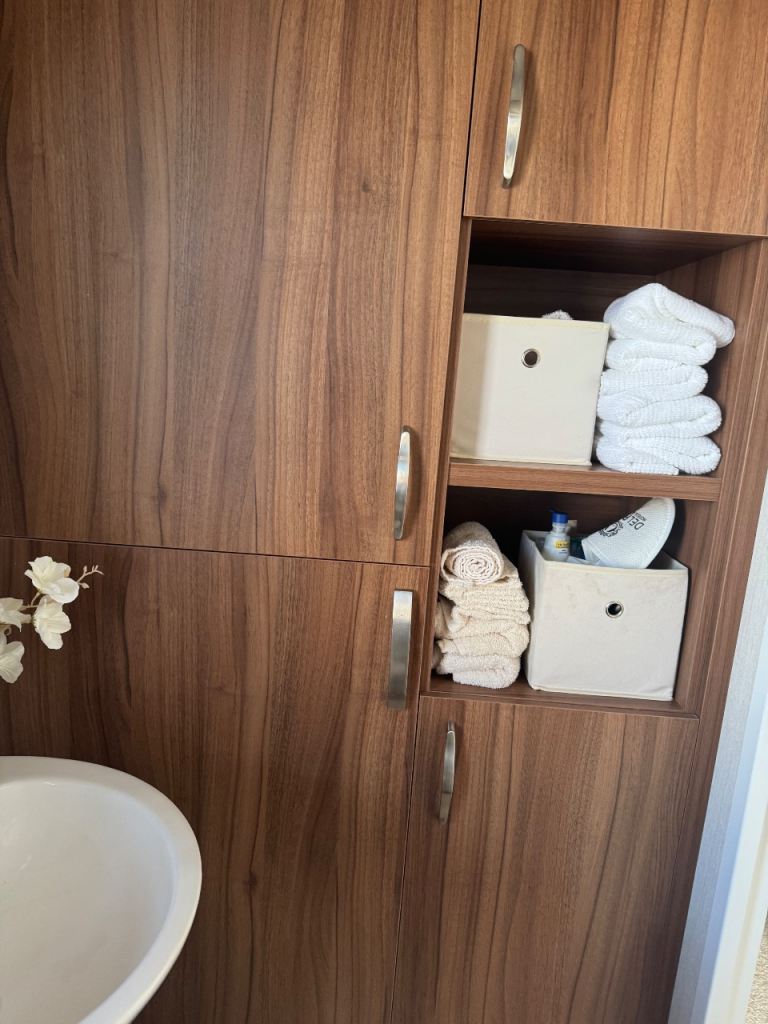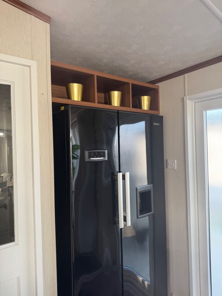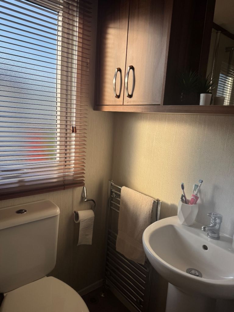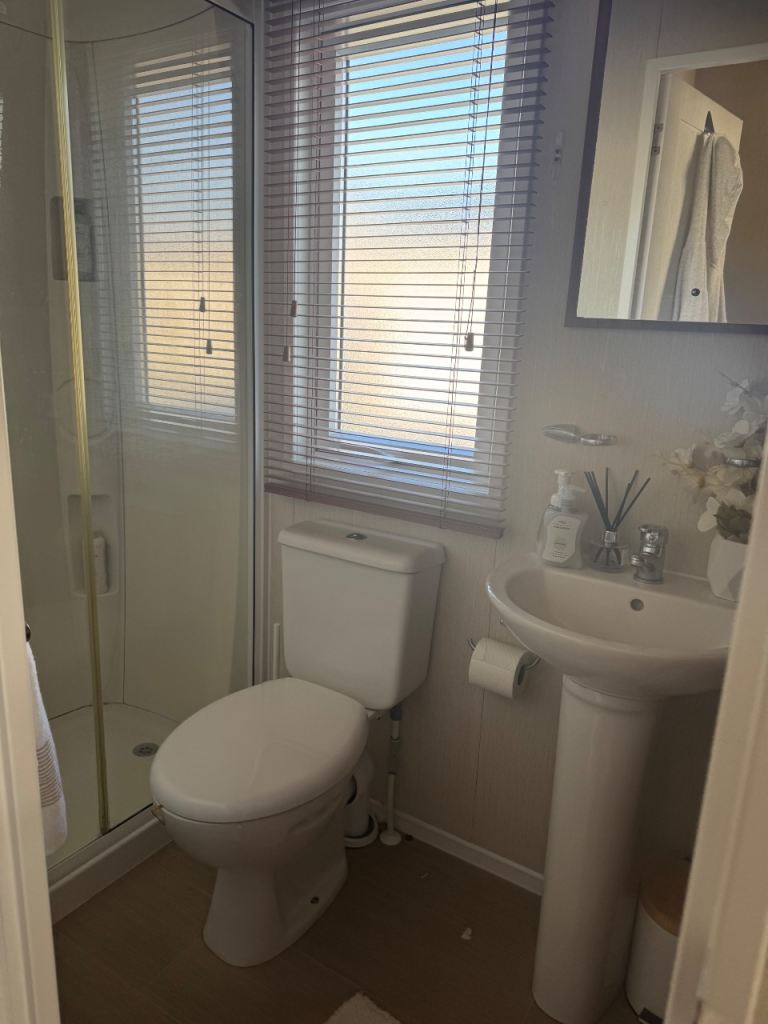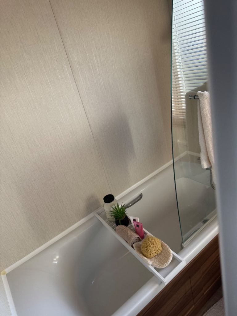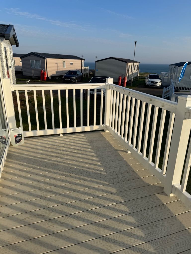 2014 2bedroom residential spec 40x13 ft unit . Side and front decking from French doors . Double glazed and central heated. Two bathrooms -one shower cubicle and other en-suite bath . King size bed in en-suite bedroom . Double bed in 2nd -tv on wall . American fridge freezer and washing machine in kitchen . Free standing sofa bed and two chairs in living room with flat electric fire. Private parking . Sea views from both deckings .No age limit on park . Contact me if any questions. Thanks .