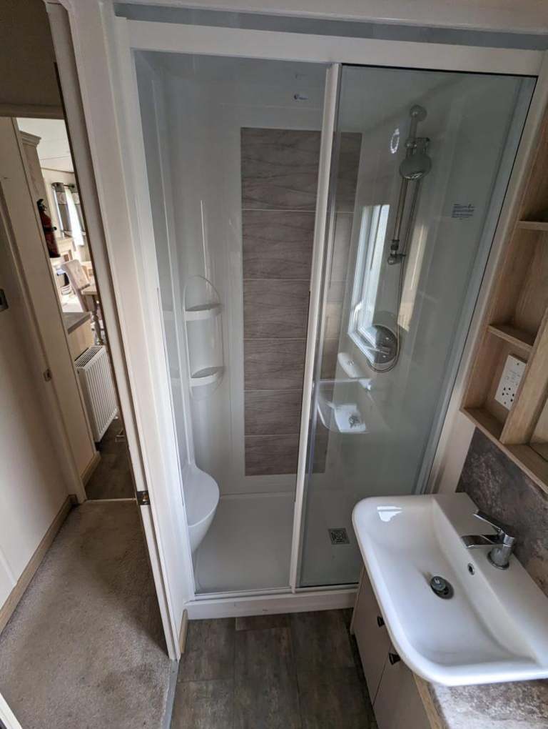 The main bathroom features a large shower cubicle, fitted cabinet, counter top basin and WC.