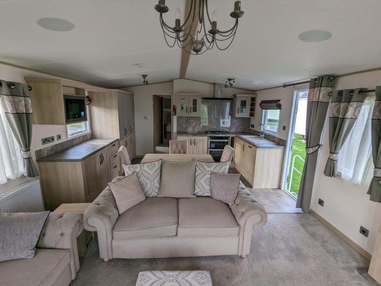 The ABI Beaumont has an exceptionally light and airy living space. With 2 sofas and a fireplace.