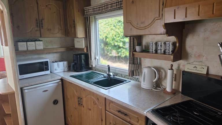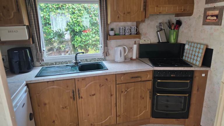 Kitchen has gas hob and oven,microwave ,kettle and toaster,all cutlery.
