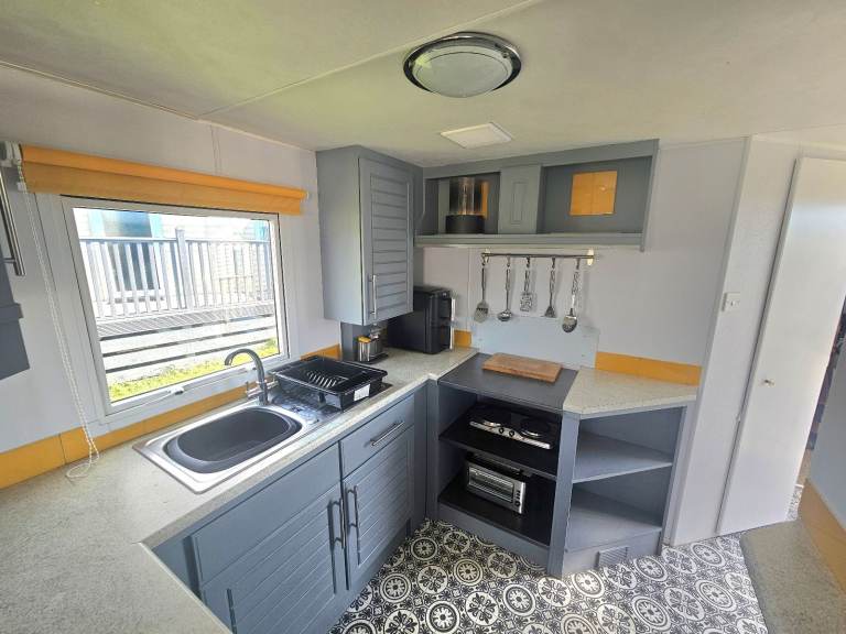 Under-counter fridge, double hot plate, microwave, kettle and toaster
