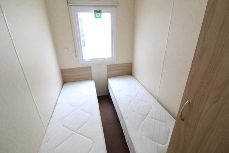 Key features: Pitched roof Two toilets A 12ft wide 2 bedroom caravan. The lounge has fixed seating and an LPG gas fire. The dining area has fixed seating and a free standing table. Fitted kitchen with an LPG gas cooker and good storage. The shower room is fitted with a wash basin toilet and standard shower. One twin bedroom and one double bedroom with an ensuite toilet. A 2008 caravan. .