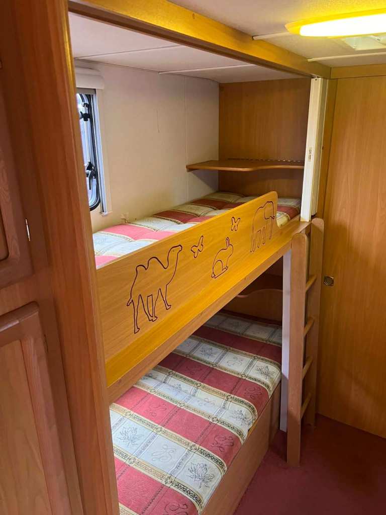 • Fixed Side Bunks: The highlight for the little ones! Solid wood bunks with adorable animal engravings and their own window.
