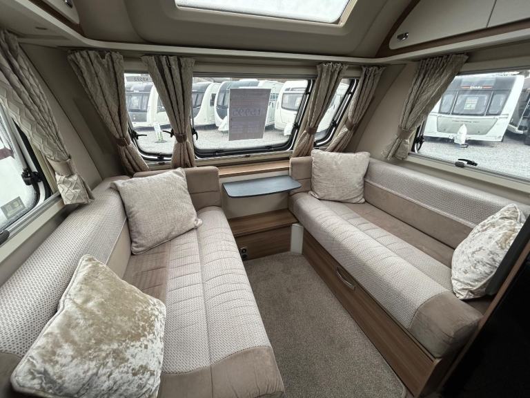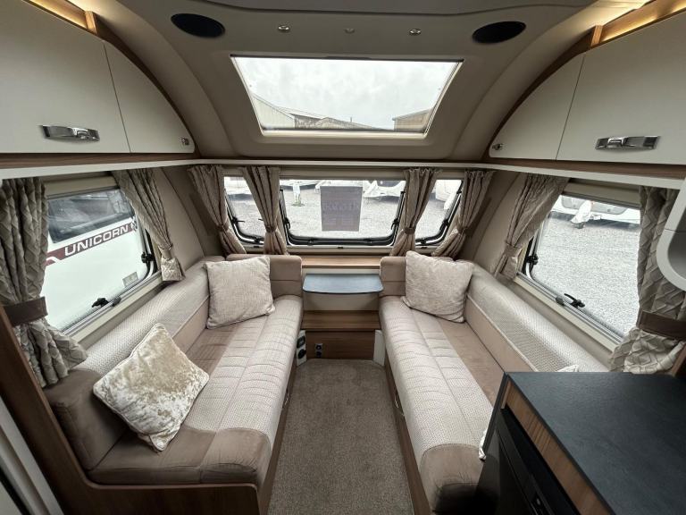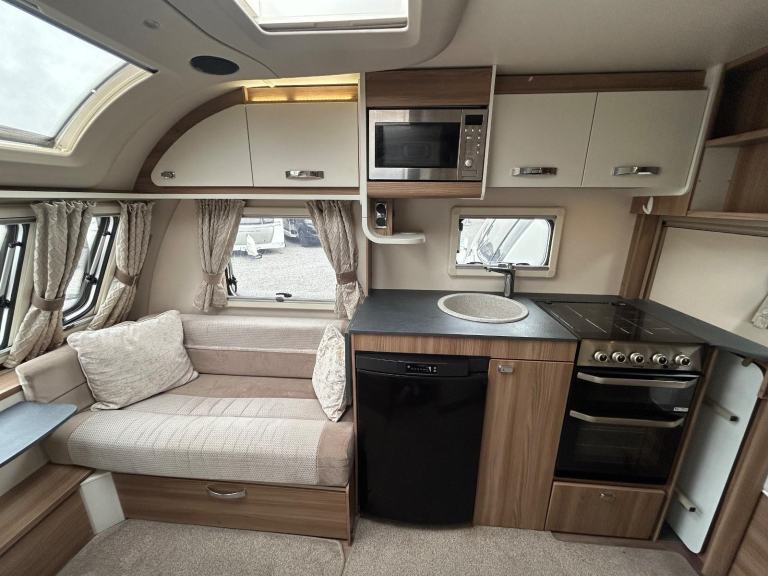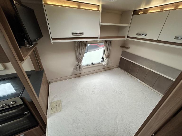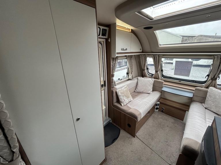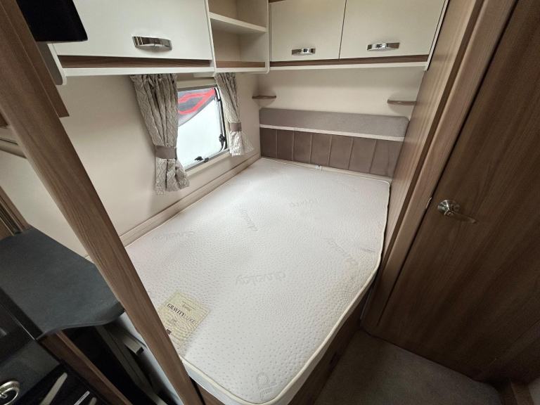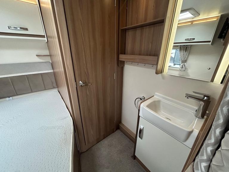 Nearside rear corner washroom incorporating a swivel toilet and divided shower area - nearside vanity unit - offside rear fixed double bed complete with adjoining wardrobes - nearside central kitchen - offside central wardrobe - 2 x singles / 1 x large double at the front - chrome grab handles - 100 Watt solar panel fitted - Alarm system - external gas BBQ point - external 240V mains socket fitted - We are extremely proud to offer for sale this 2019 model tourer, this model is in amazing condition throughout - lightweight in comparison to its competitors!