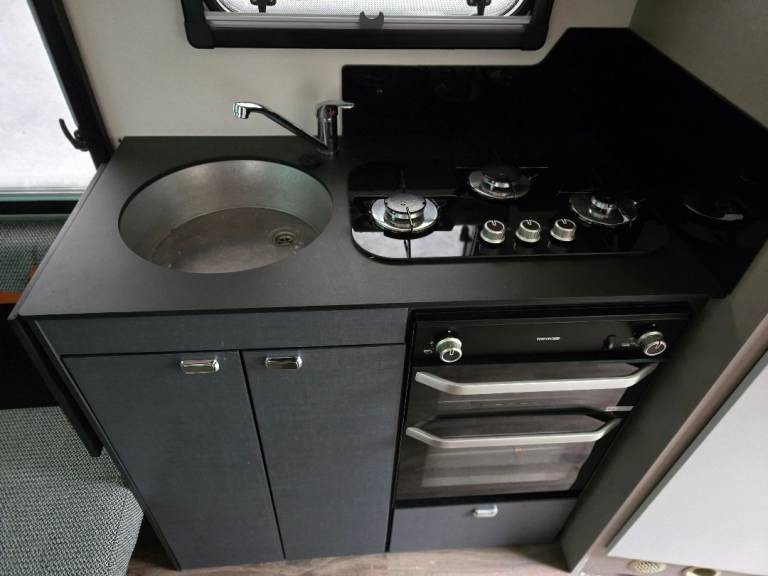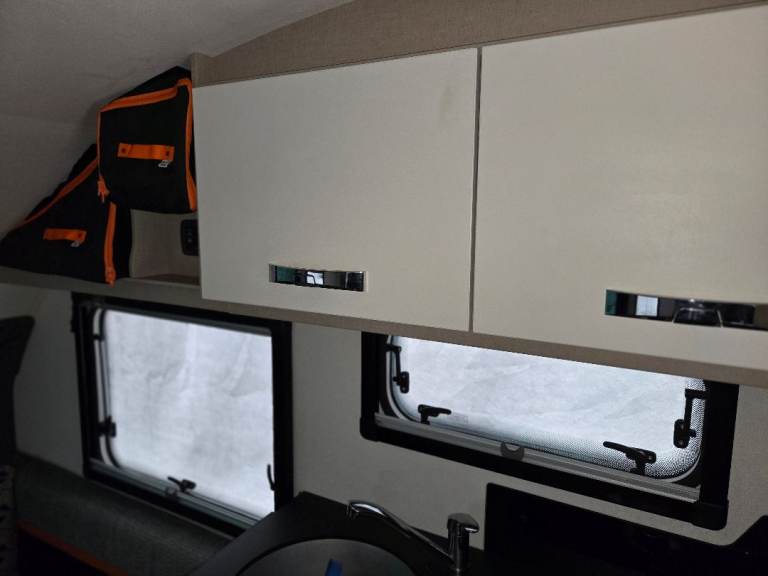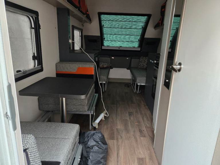 A 3 berth caravan designed to allow carrying canoes or bikes in transit. Excellent condition inside and out. Come ready for use with awning, gas, water and waste tanks. Leisure battery, motor movers, TV aerial and solar panel. Currently it is snug under a bespoke winter cover, as it is standard SE fit for the year with orange and black on white designs and alloy wheels similar vans can be seen on line, or you can contact me to have a look.