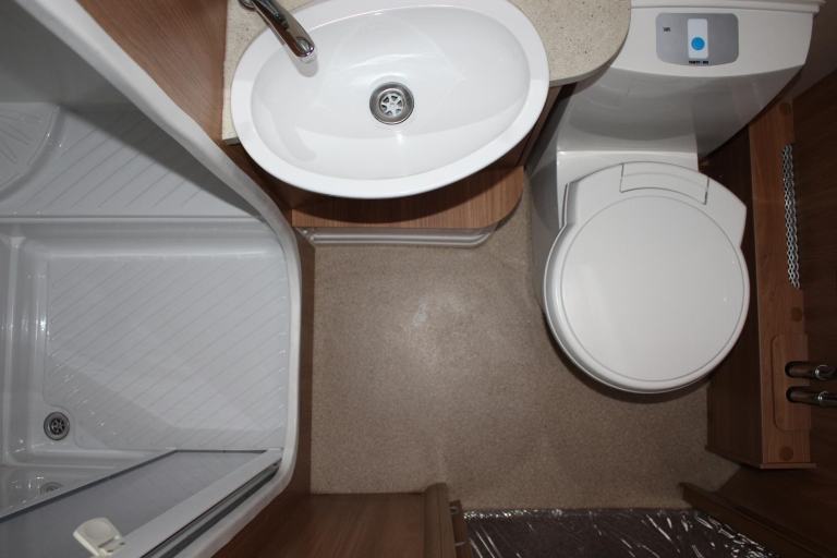 Centre washroom with cassette toilet, hand wash basin and separate shower cubicle