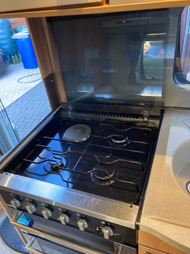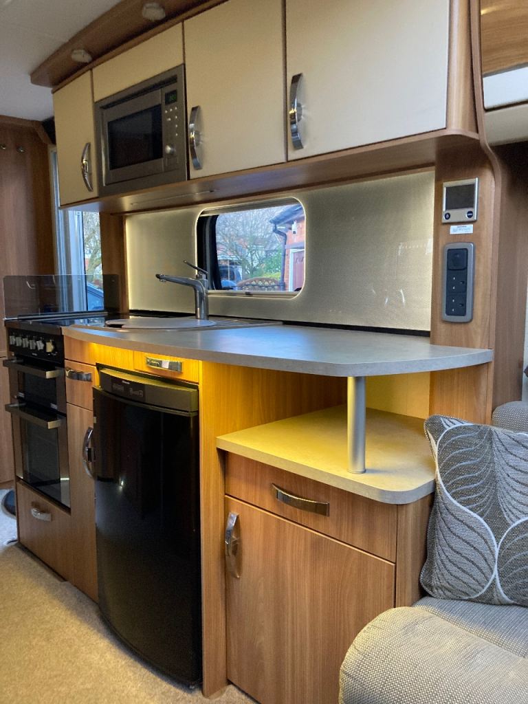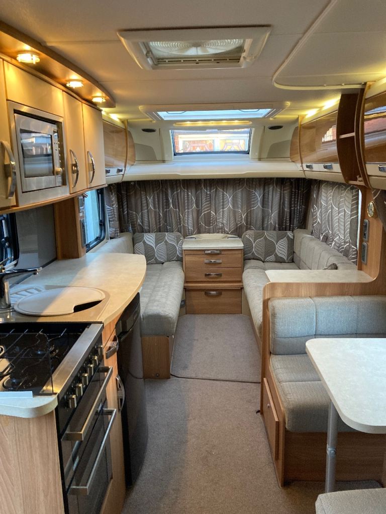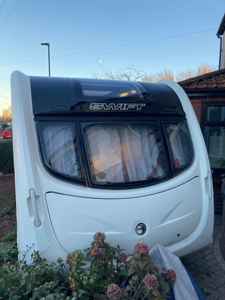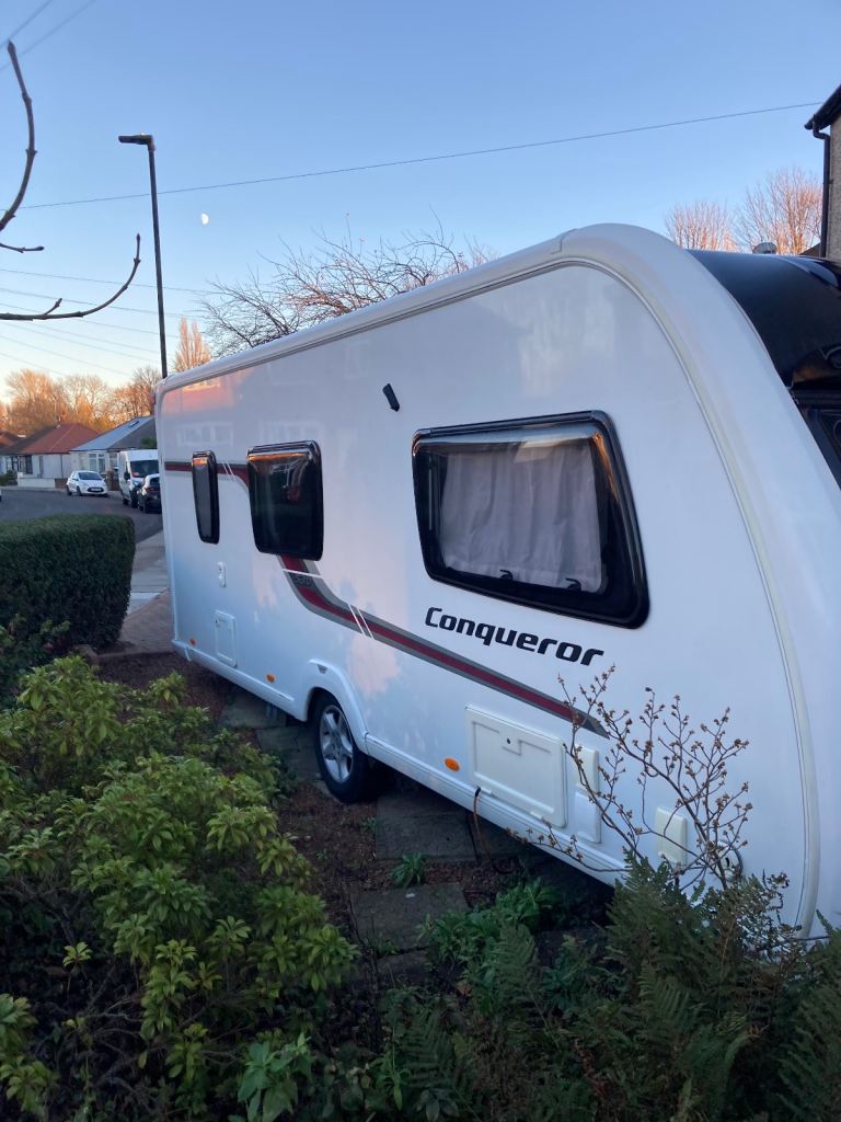 Swift Conqueror 530 Caravan for Sale 2014 4 Berth in excellent condition. Reduced in price for quick sale as replacement is on order. The conqueror was top of the range produced by Swift, this model is no exception being built on a “ None Timber” frame with superior insulation. It comes fitted with “Alko” electric and gas hot water and heating system, hob with three gas burners and one electric plate, oven and separate grill, extractor fan, microwave, three way ( gas, 240v electric, battery) fridge freezer, rear bathroom with separate shower cubicle.