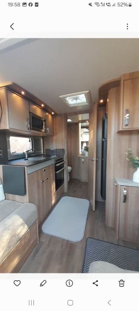 The centre kitchen has lots of modern features including a hob, oven, grill, built in microwave and tall Dometic Fridge/ Freezer.