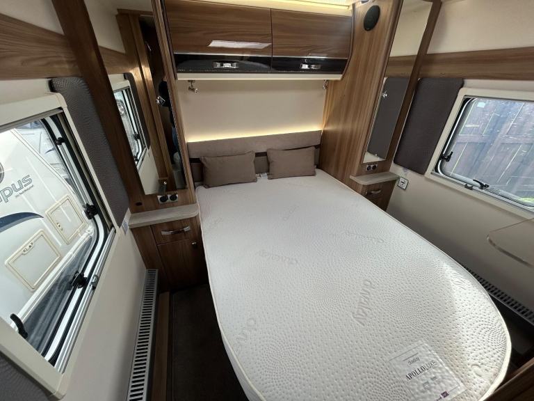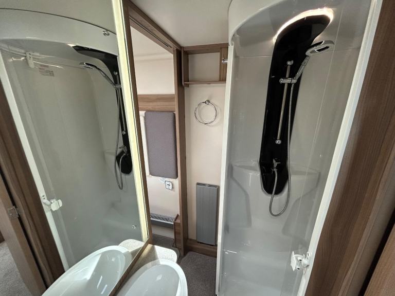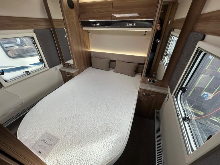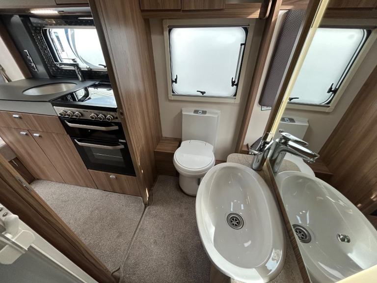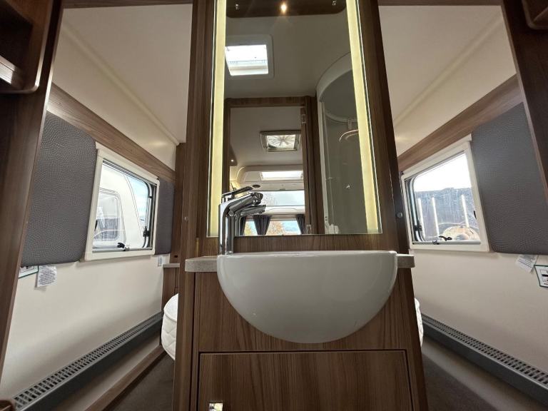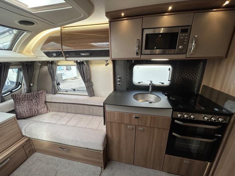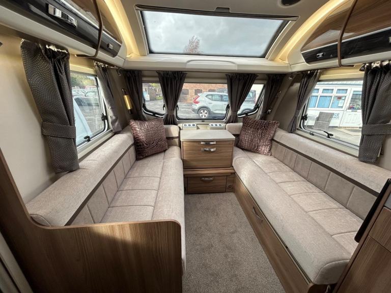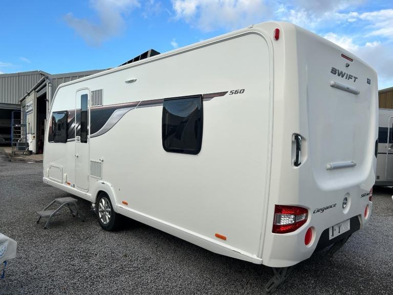 2020 SWIFT ELEGANCE 560 / 4 BERTH - Rear bedroom featuring forward facing island bed with adjoining wardrobes - central dressing room boasting individual shower cubicle , central vanity unit and toilet - central offside kitchen - 2 x 6' singles / double bed / lounge dining area at the front s a luxurious 4-berth caravan, perfect for your next adventure. With a length of 7540mm and a MTPLM of 1684kg, this well-designed caravan offers ample space and comfort for a family or a group of friends. The interior features a modern and stylish design, with high-quality furnishings and amenities. The Elegance 560 is equipped with all the necessary facilities for a comfortable stay, including a fully functional kitchen, a spacious living area, and a cozy sleeping area. With its elegant exterior and top-notch features, this Swift caravan is the epitome of luxury and convenience on the road.