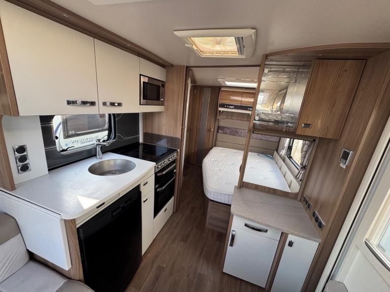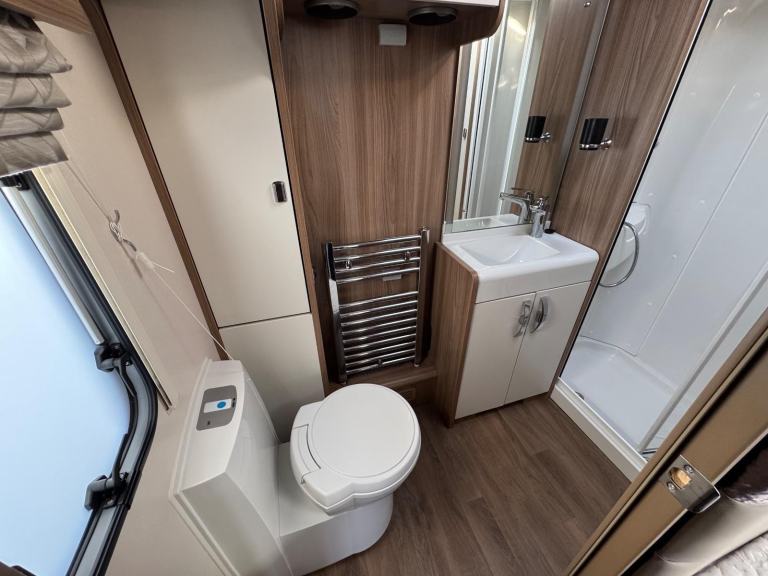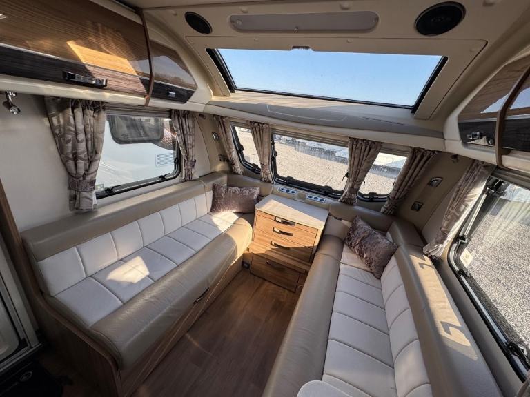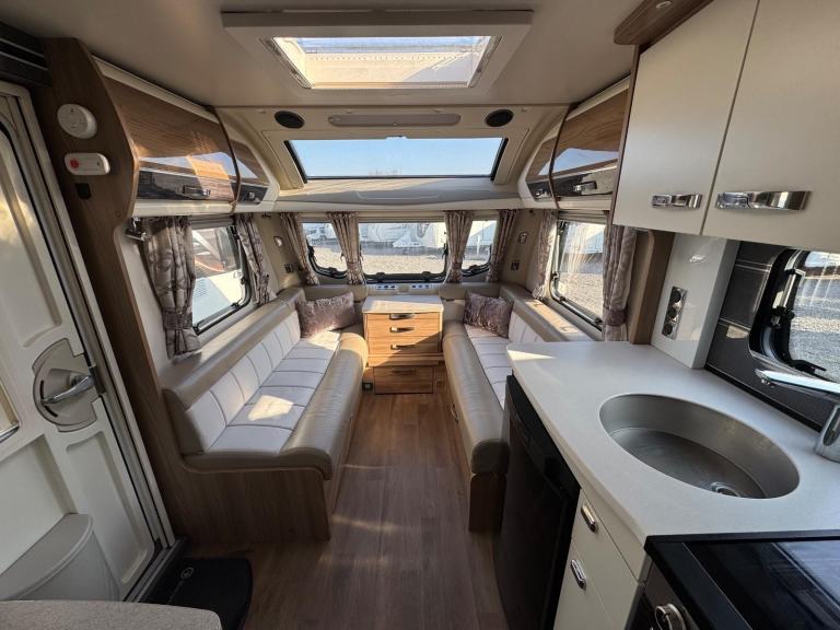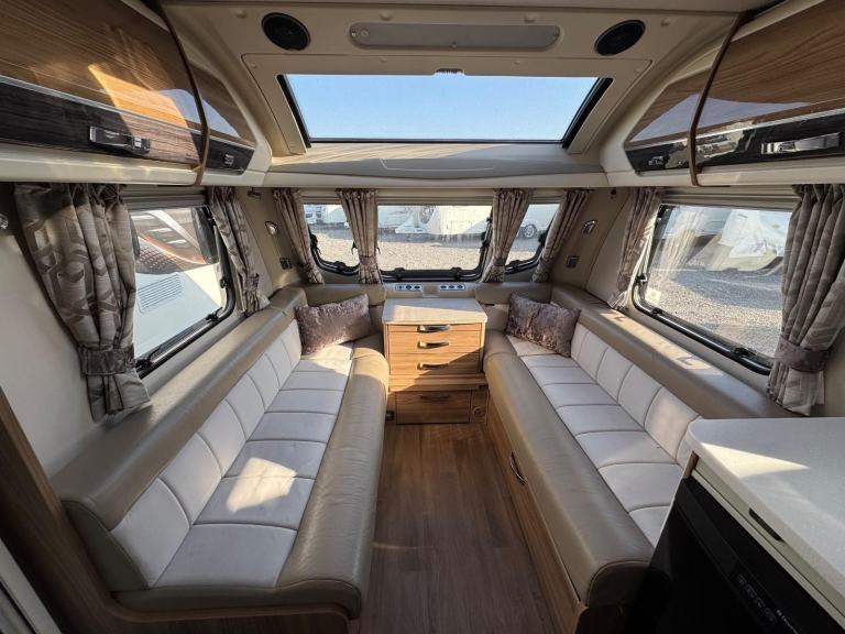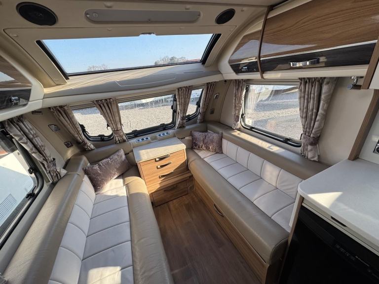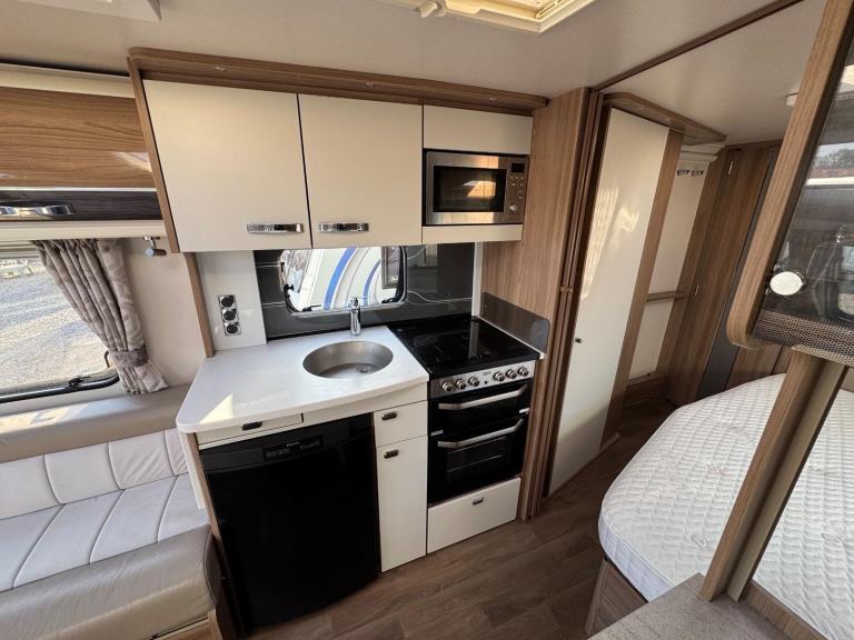 2016 SWIFT ELEGANCE 570 / 4 BERTH - full rear dressing room featuring individual shower cubicle, toilet and vanity unit - nearside fixed french bed - offside wardrobes - central offside kitchen - 2 x singles / double at the front - this is an IMMACULATE EXAMPLE of a top quality model boasting a top specification - a credit to it's previous owners