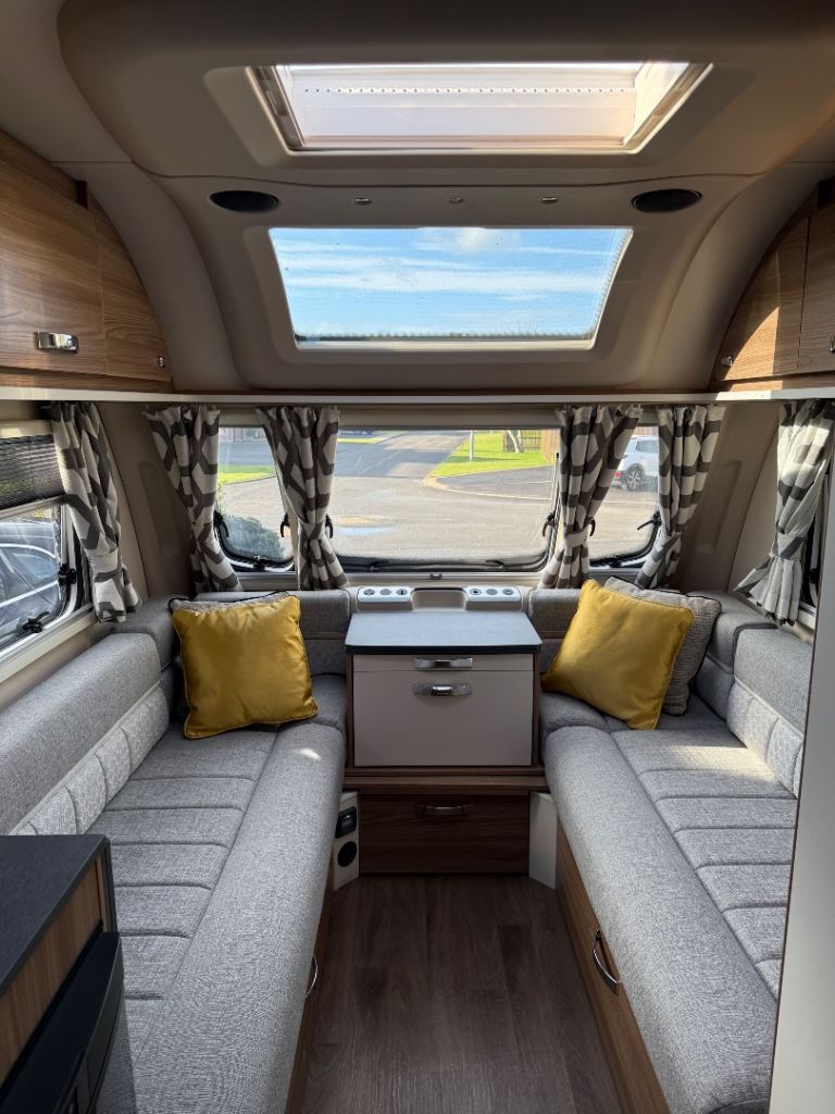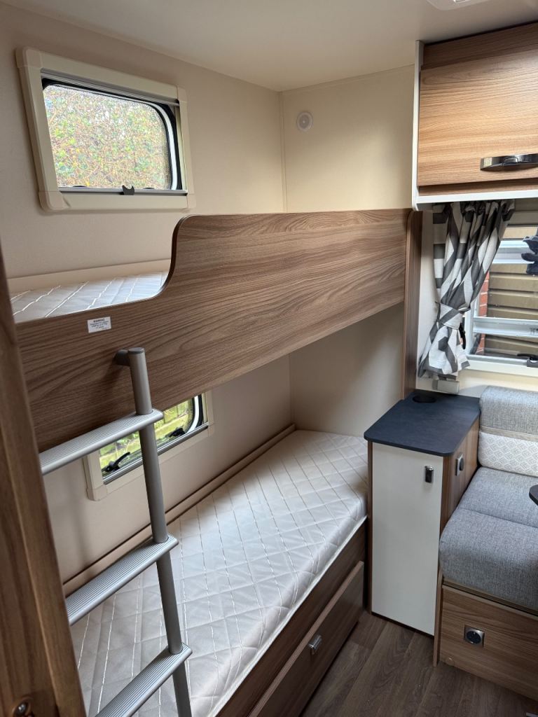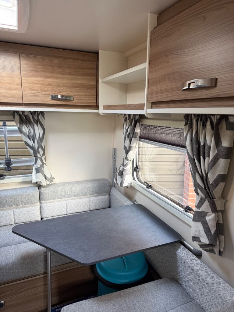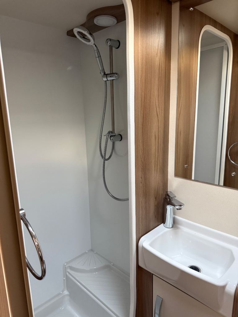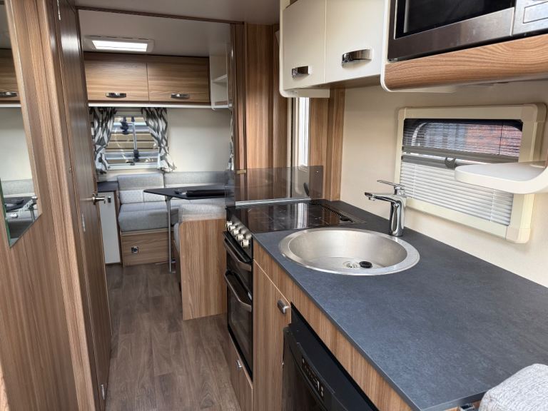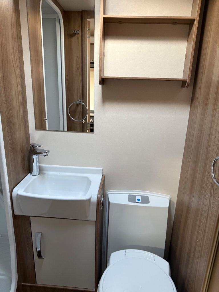 Midship kitchen is fully equipped with a full sized cooker, sink, 3 way fridge freezer and a microwave, Bathroom has a separate shower cubicle, wash hand basin, cassette toilet and a vanity unit. Plenty of storage lockers throughout the caravan for your travel essentials.