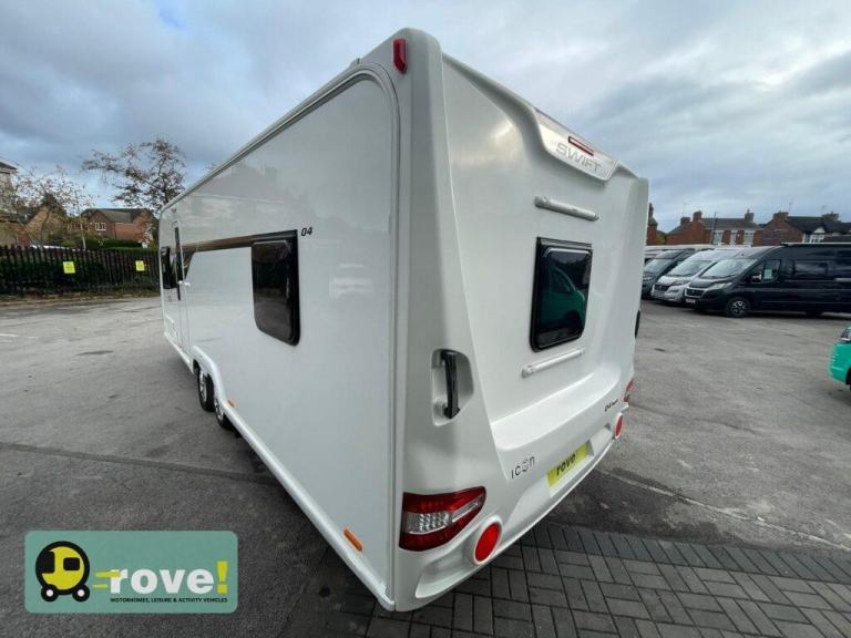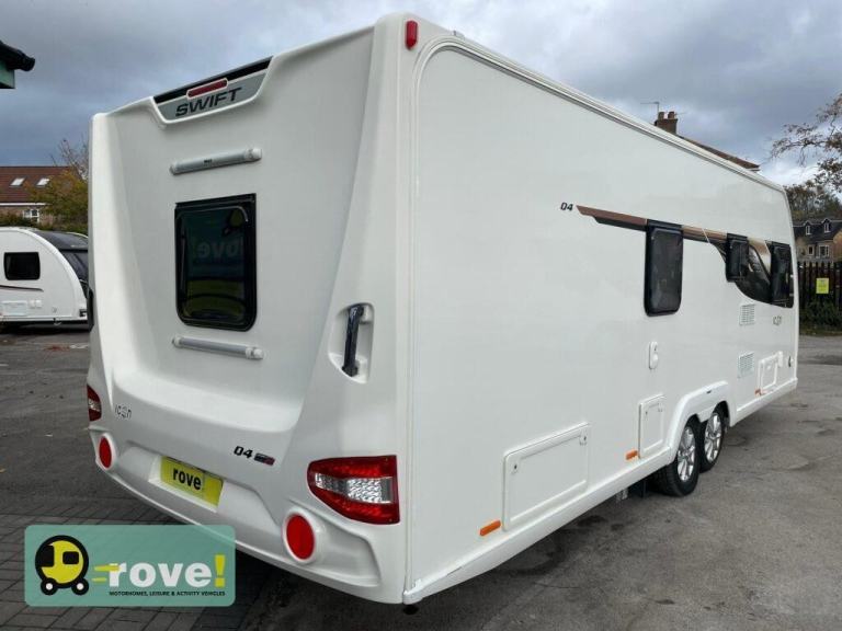 Rove! Motorhomes Selston we have this Swift Icon Q4 twin axle Caravan which is perfect for those who love to enjoy the leisure life on the road, this 2020 Swift Super Quattro Icon Q4 8 foot wide caravan offers a 4-berth layout with a clever and spacious design.