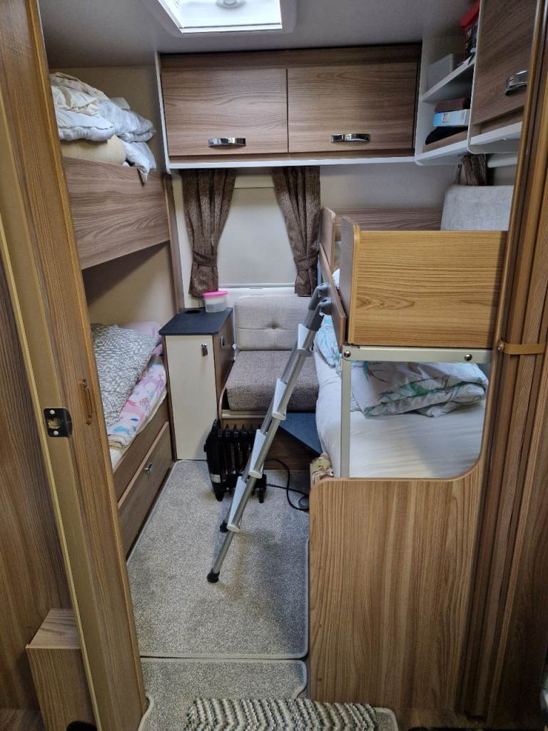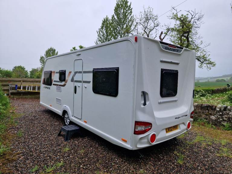 The Swift Major 6TD (2022) features a family-friendly layout with a front lounge that converts into two singles or a double bed, a central washroom with a separate shower, and a rear sleeping area with two fixed bunk beds and a side dinette that converts into a fourth single bed with a bunk over it. This flexible design sleeps up to six people.