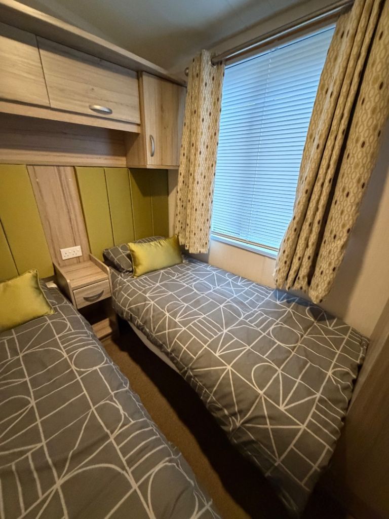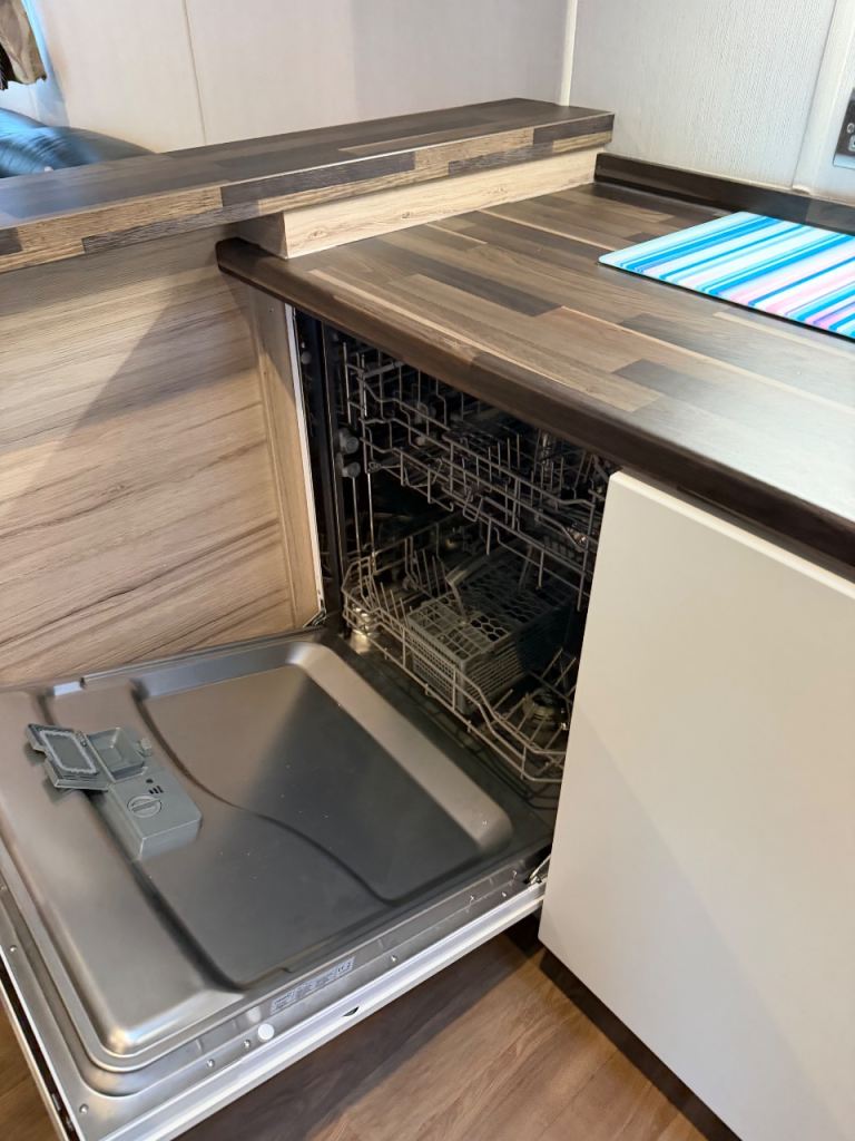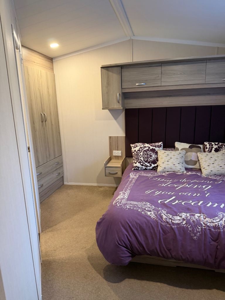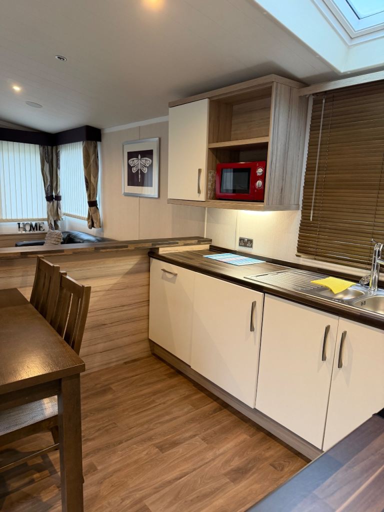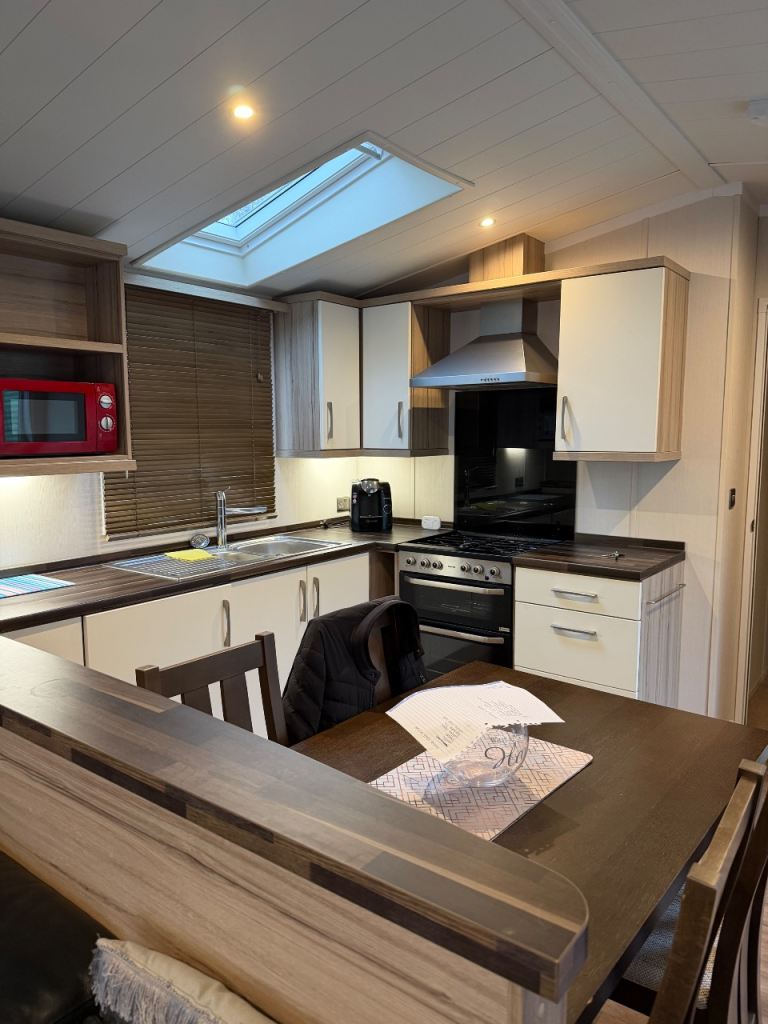 This holiday home has been well looked after. The master bedroom has a full bathroom leading off the bedroom and an elegant vanity unit. The twin room boasts overhead storage and is a clever use of a smaller space. The kitchen includes an integrated dishwasher and washing machine in the spacious kitchen with streams of natural light from the Velux.
