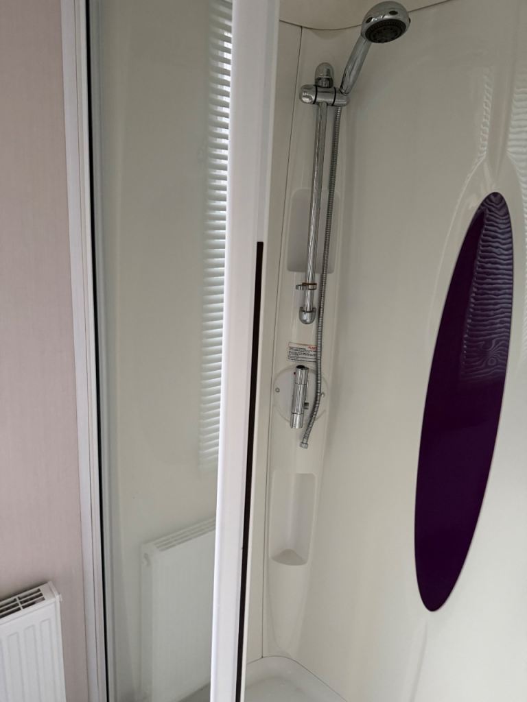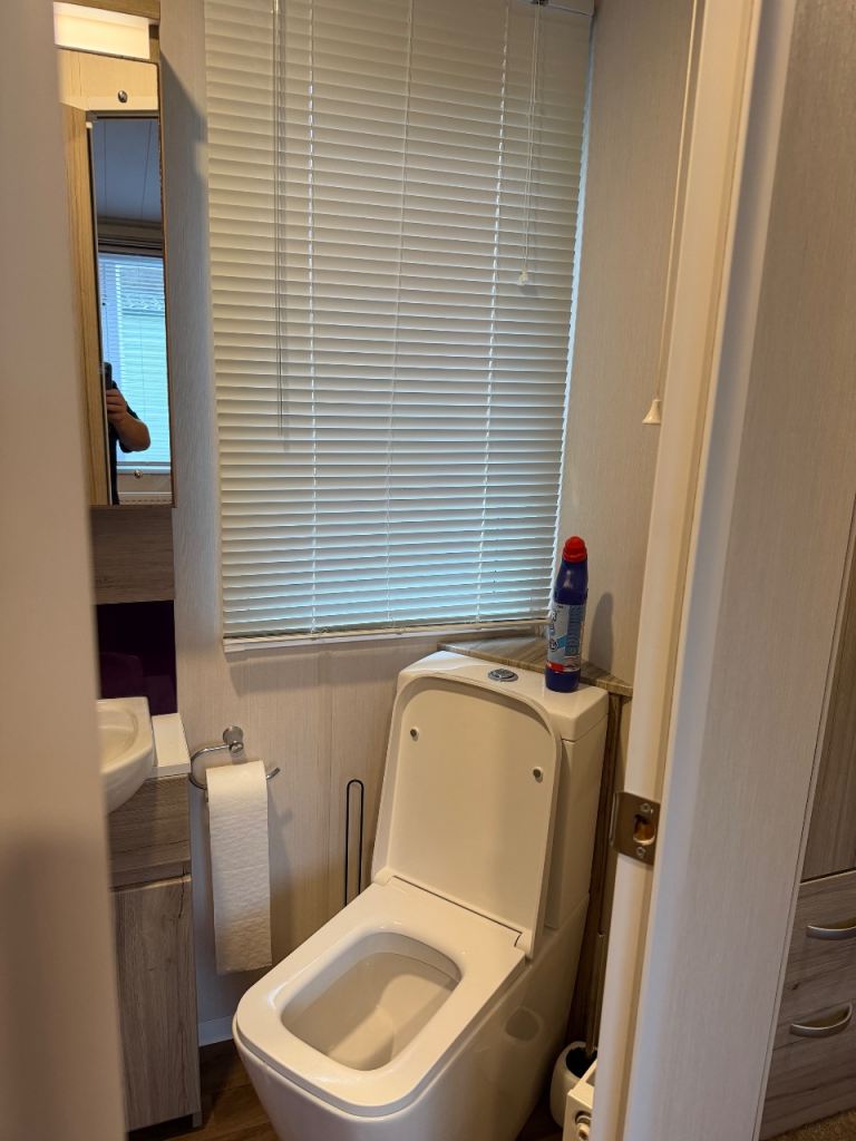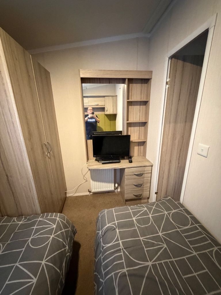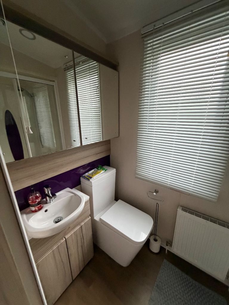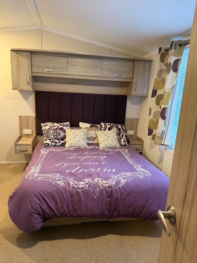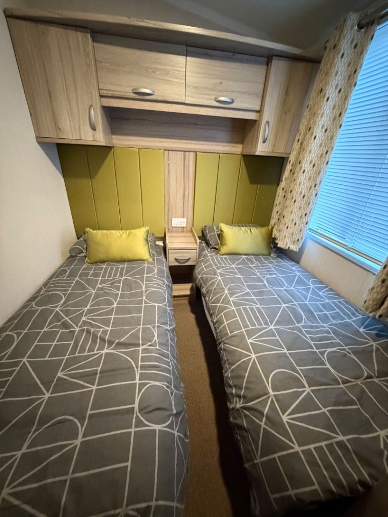 This holiday home has been well looked after. The master bedroom has a full bathroom leading off the bedroom and an elegant vanity unit. The twin room boasts overhead storage and is a clever use of a smaller space. The kitchen includes an integrated dishwasher and washing machine in the spacious kitchen with streams of natural light from the Velux.