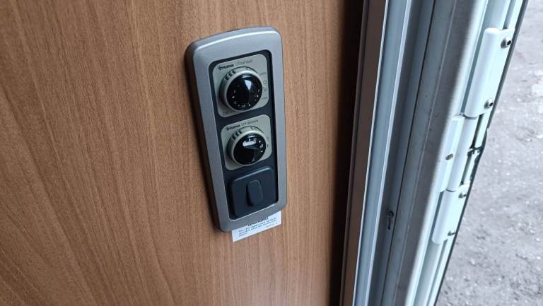 Waterbutt waste container and loads of pipes in front locker