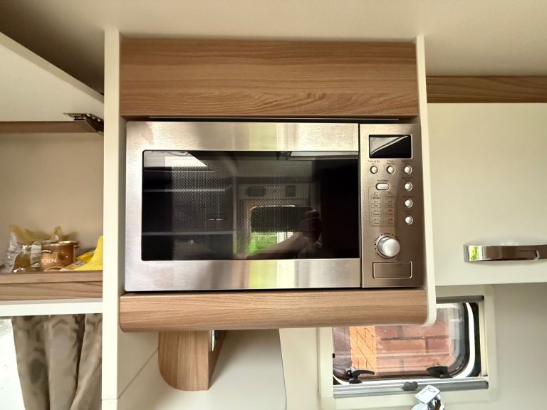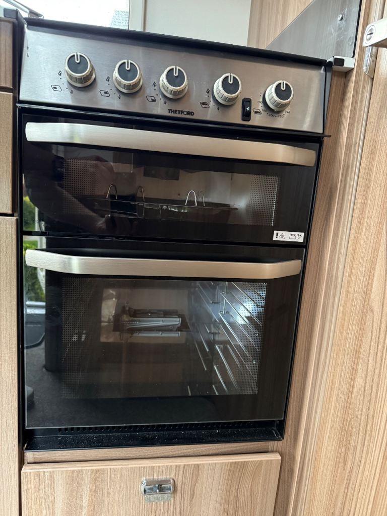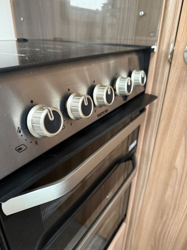 Kitchen area includes a Thretford gas oven, grill and hob, microwave and Dometic fridge freezer and storage space.