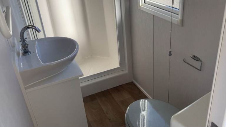 The second bedroom has a set of twin beds, with plenty of storage space. The classic style shower room is practical and compact. It includes a shower cubicle, toilet and basin.