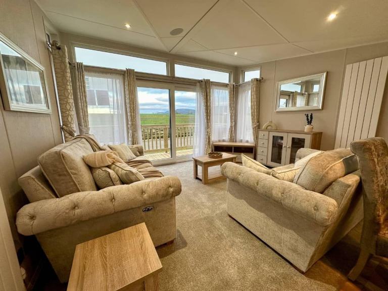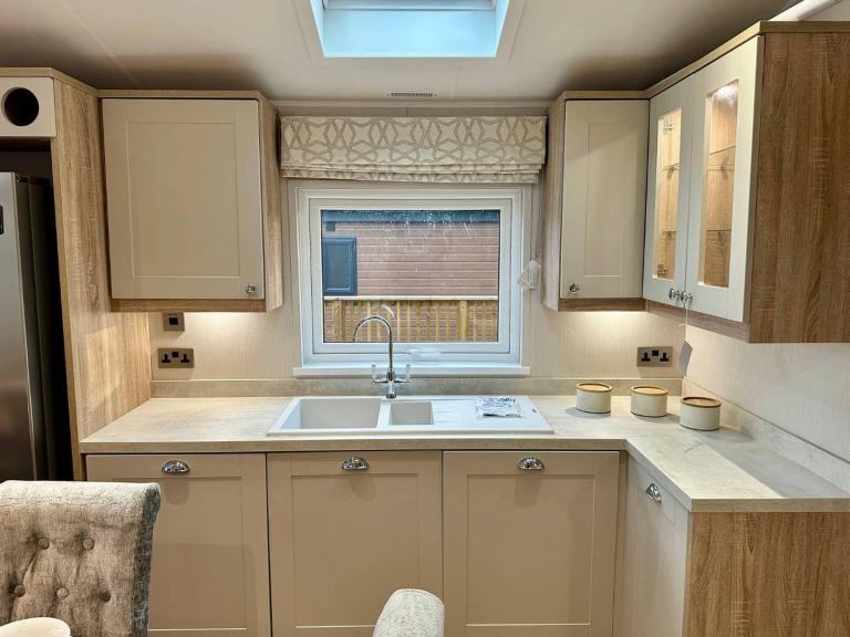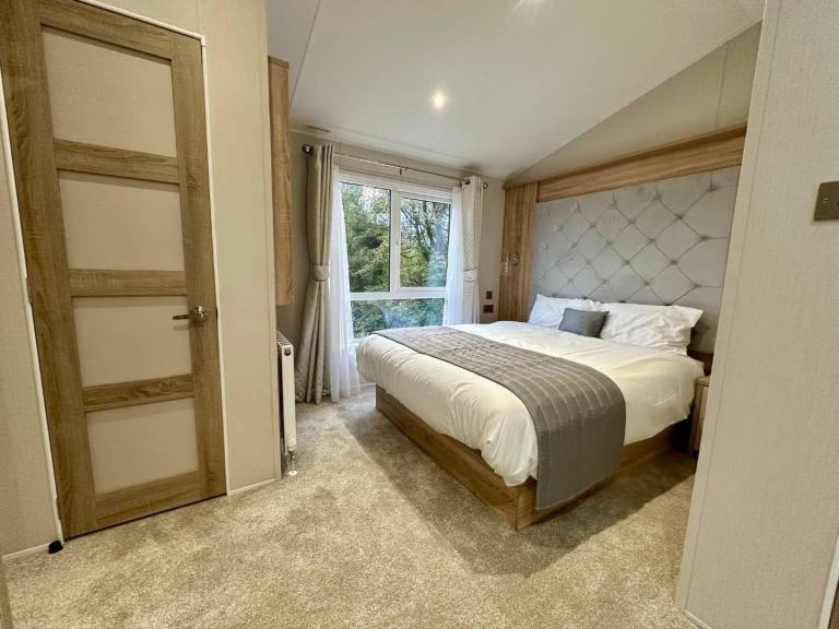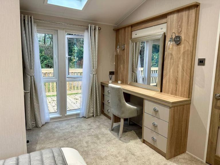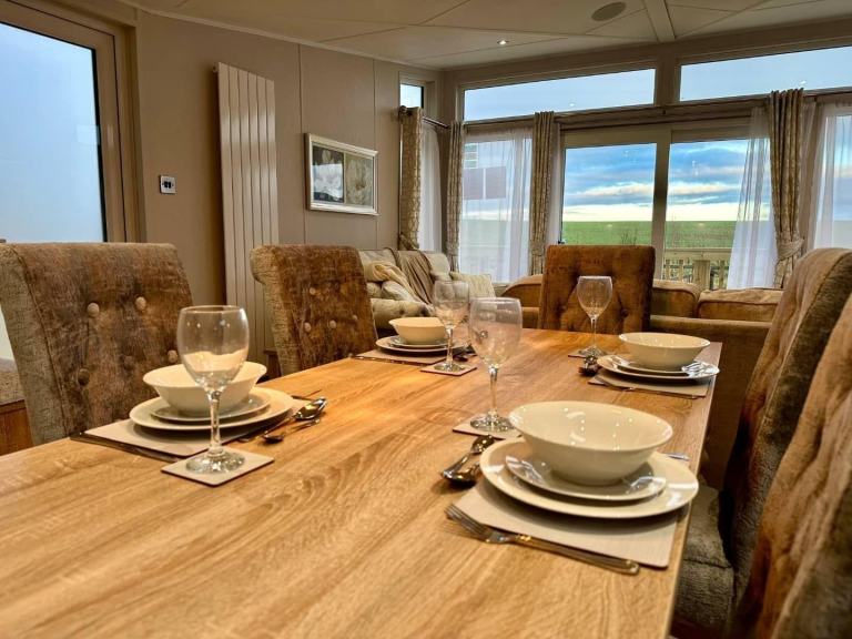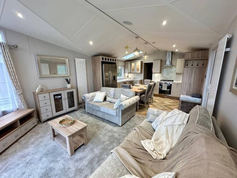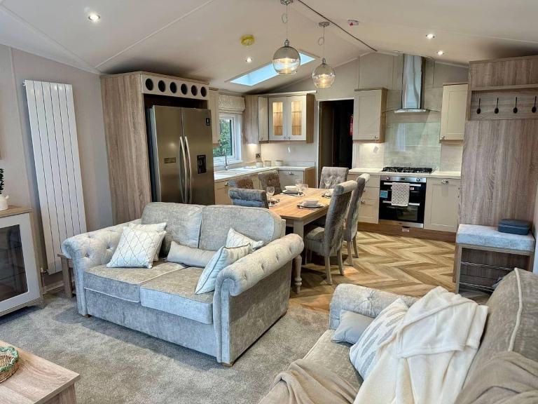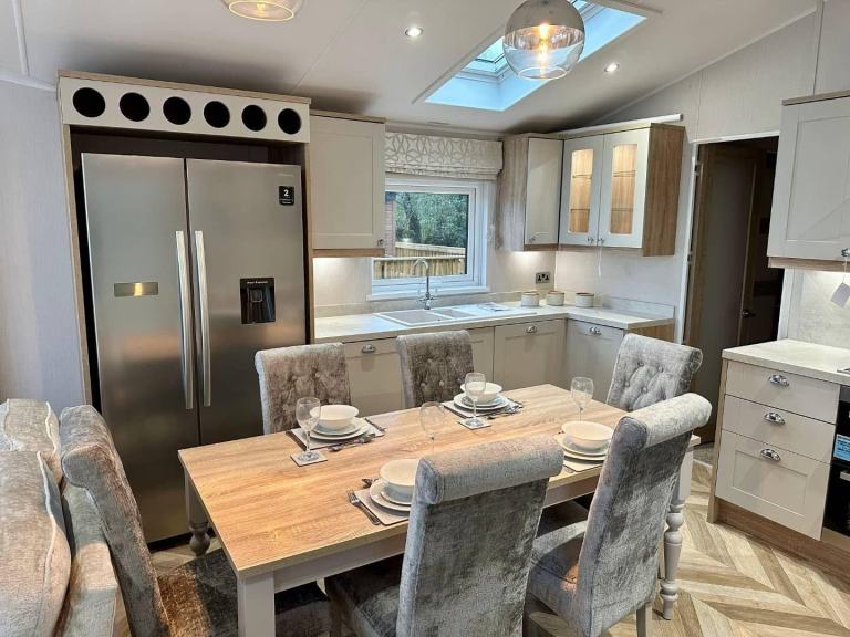 This stunning holiday lodge features 2 bedrooms, with a striking exterior and a luxurious, well-appointed interior. The lounge offers a spacious relaxation area, while the kitchen comes equipped with an American-style fridge-freezer, wine rack, and a six-seater dining table—ideal for hosting guests.
