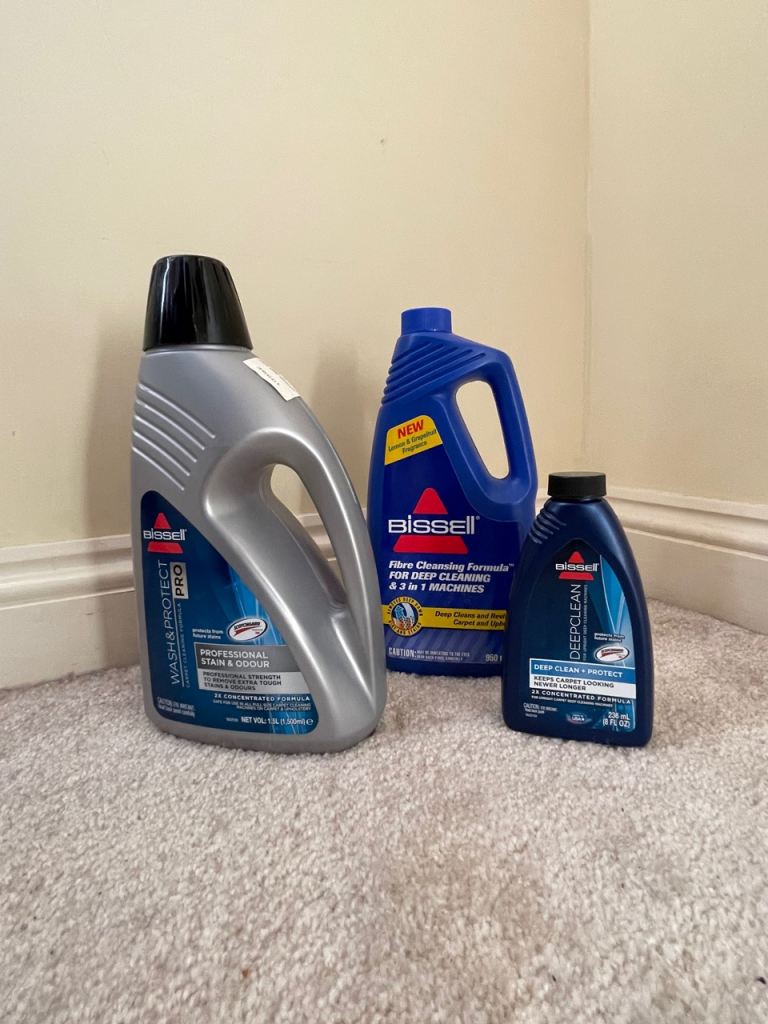 Includes part used bottles of BISSELL cleaning solutions. Just measure out solution with cup provided then add to water tank and fill tank with warm tap water. Machine has a rotating brush to lift up hairs. It can be switched from floor cleaner to upholstery cleaner in order to use the tube and attachments included. - Collection only