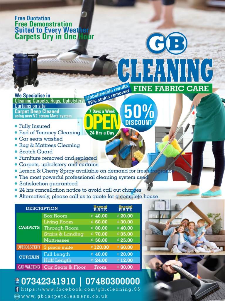 Also, we have many property agents who we cover for cleaning. We have excellent 20 v2 steam mate machines that tackle all sorts of dirt and dry in 2 hours. Our company has a sale offer on and we're offering a 50% percent discount on all jobs. We have attached our leaflet /flyer please feel free to read through the services and the great sale prices on offer. We are fully insured. Feel free to get a free quote for jobs and a demo. Also, we offer a greater price reduction for letting agents. We offer general and spring cleaning services. Our workers offer a very friendly and professional service. We take jobs from customers with special needs and disabilities too. Our customers never go back to another company. We offer our customers a 24 hours and 7 days a week service to suit our customer’s needs.
