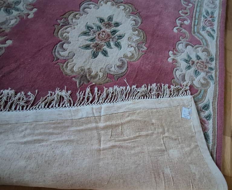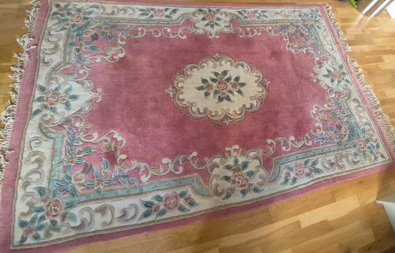 Lovely wool carpet, clean and in very good condition. Very large size approx 8 x 5'. Pink/ salmon colour. Barely used.