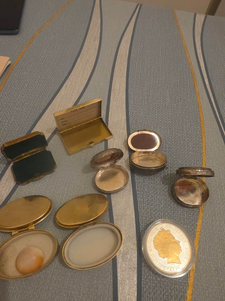 For sale 7 little boxes 3 its silver plus one coin £5 the head is gold please offerts