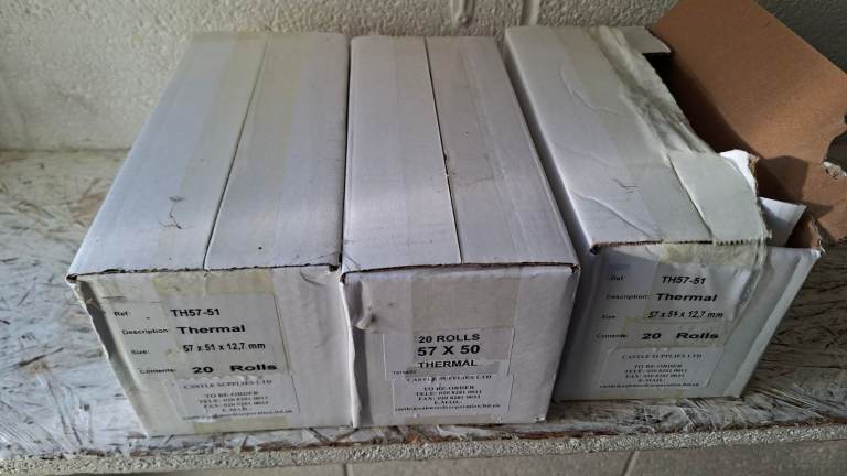 Complete with 3 boxes (1 partial) total 55 thermal printer rolls (worth £45 alone).