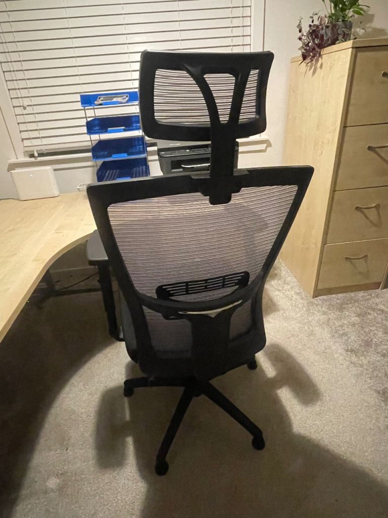 Handsome office suite for sale, including chair with lumbar support and height adjustment.