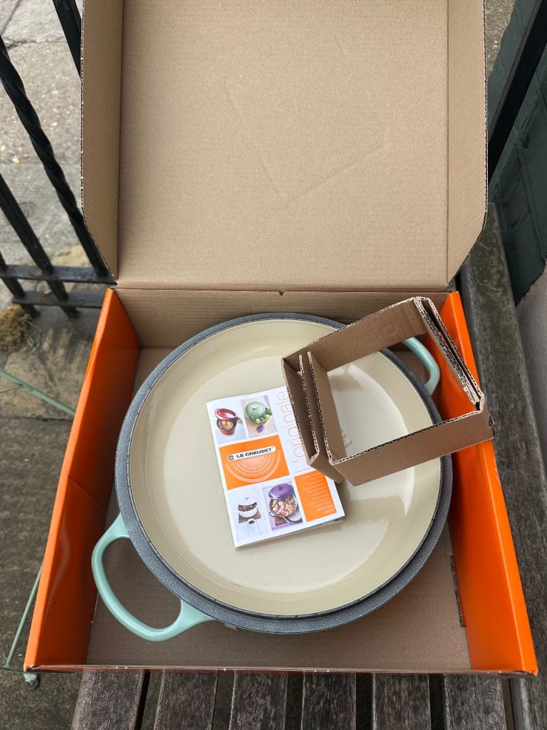 30 cm cast iron shallow casserole dish in “cool mint” colour, brand new from the box and never used before, available for a negotiable discounted price.