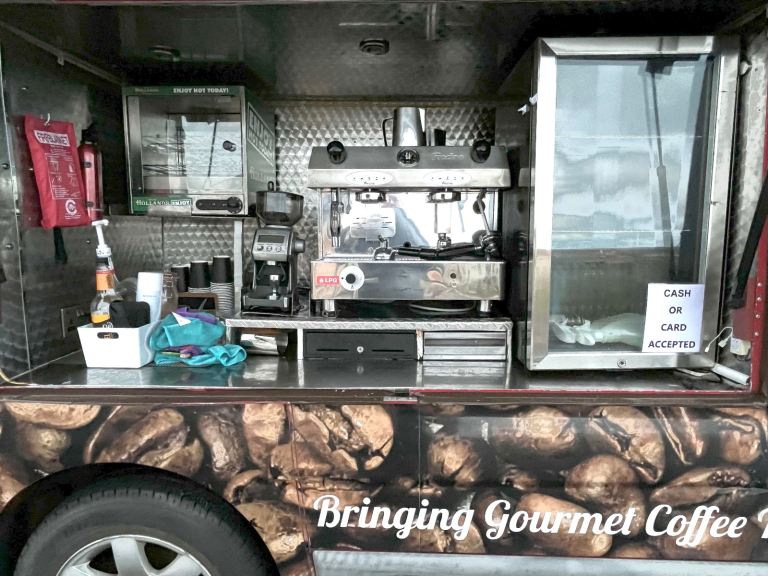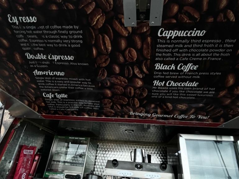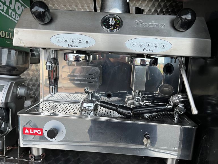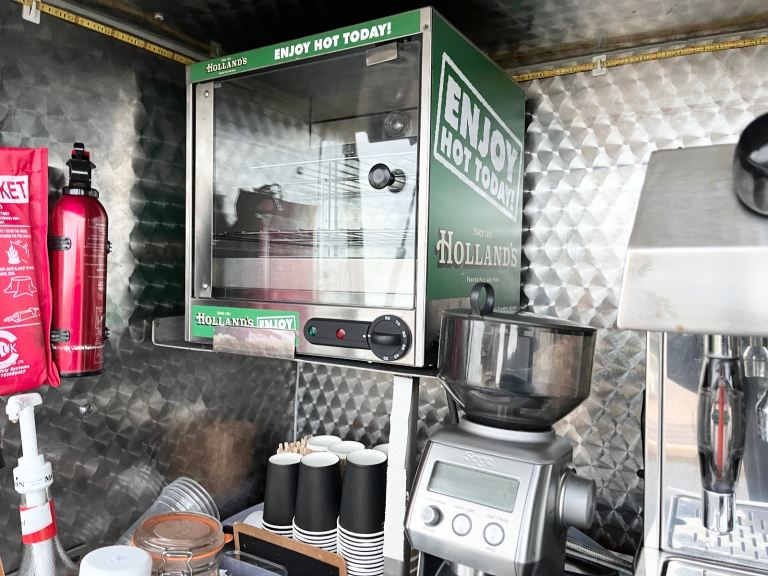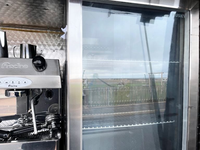 This is a full contained coffee van , full electrics , top range Italian coffee machine , counter top hot food cabinet, counter top fridge cabinet, counter and walls installed with catering metal panelling ( so fully compliant with hygiene standards) .